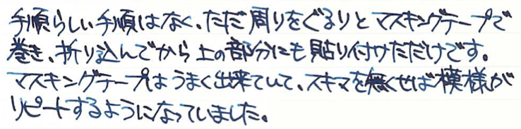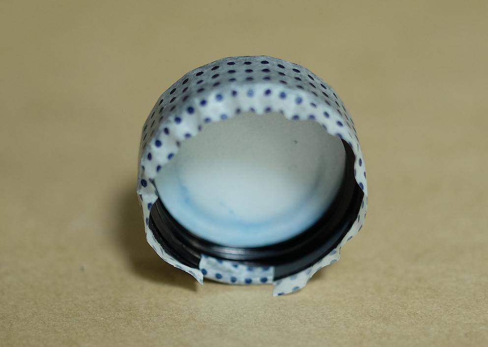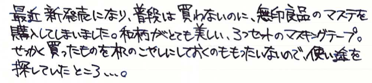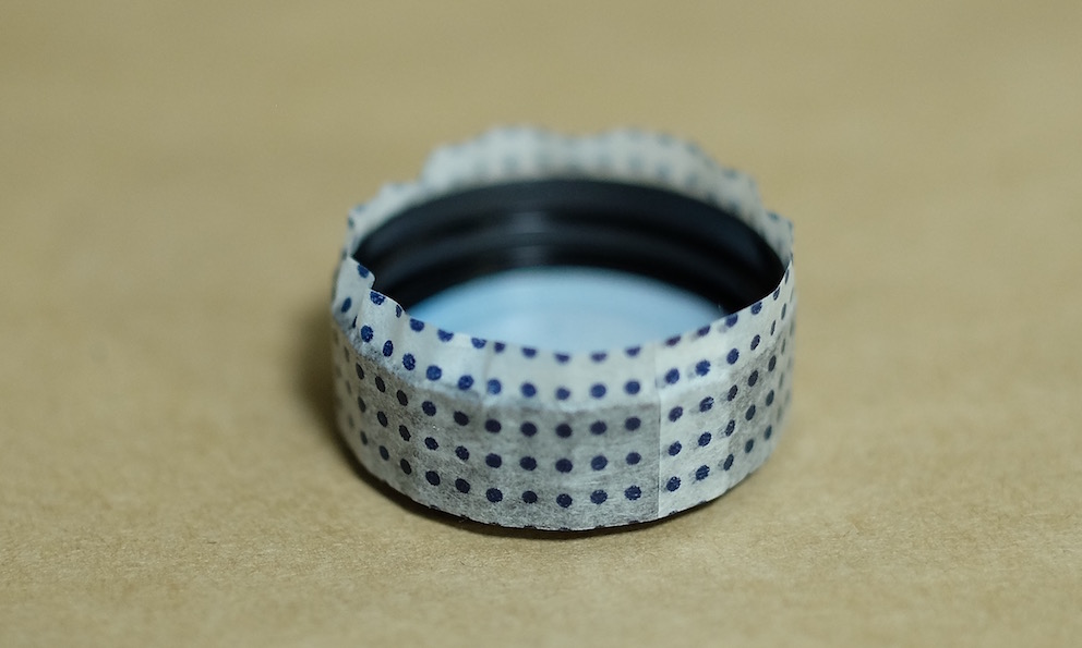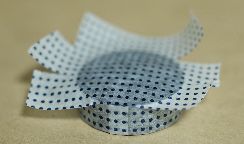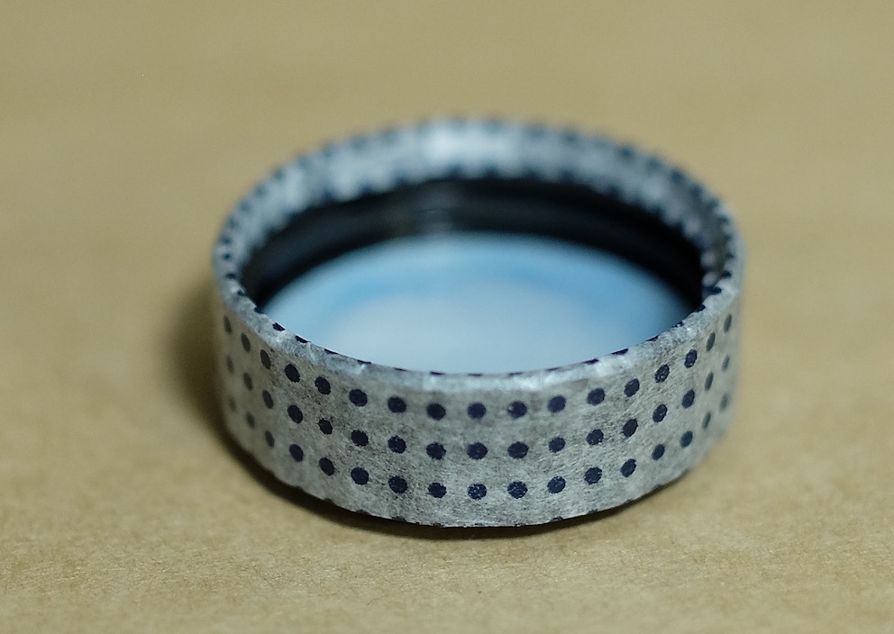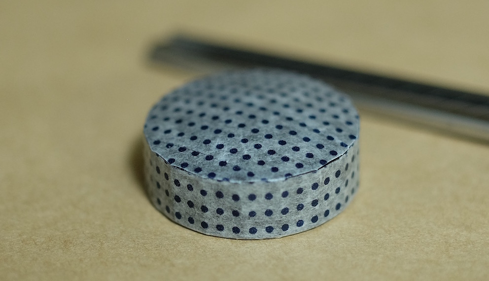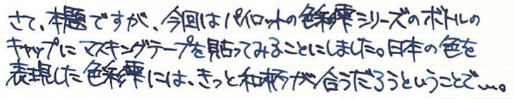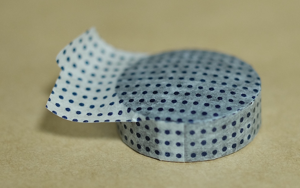 コラム:マスキングテープで色彩雫のキャップ飾り Category:アナモノ Date:2016年01月26日 ツイッターのタイムラインを拝見していると、人気なのがマスキングテープ。本来は文字どおり、塗料を塗りたくない部分を隠すためのテープなのですが、飾り用としても最近はいろいろな柄のものが出ているようです。わたしがすきな無印良品から、昨年末に新柄のマスキングテープが発売になったようでこれまでの渋目の色のマスキングテープに加え、和柄のものが発売になっておりました。しかし、買ったは良いものの普段マスキングテープを使う機会がありませんもので、持て余していたのが現状。愛好家さんたちはノートへのちょっとした飾りや、付箋代わりに使っている方もいる様子ですが。 この和柄マスキングテープは藍色で、青系統の色彩雫に合うと思いましたので、今回は松露、月夜、深海の三色で試しています。 まずはぐるりと周りをマスキングテープで巻き、少しずつ切り込みを入れてキャップの内側に折り込んでいきます。これで外周は完成。 あとはキャップの上の部分にマスキングテープを隙間ができないように貼り、余計な部分をカッターで切り除いただけになります。マスキングテープは思ったよりも伸びがあり、少し失敗したくらいならなんとかなってしまいます。 松露には水玉模様、深海には青海波模様、月夜には麻の葉模様をそれぞれ貼ってみました。思いの外良い感じで、マスキングテープにはまってしまうかも。 PR