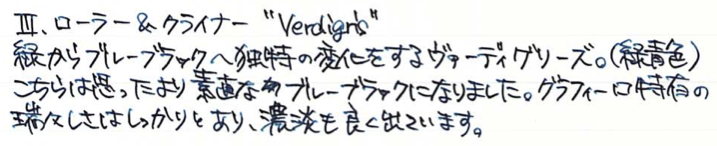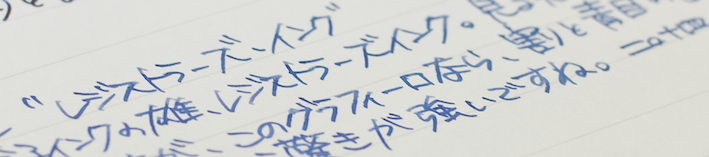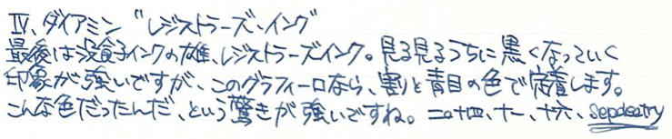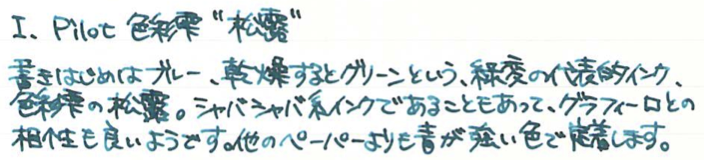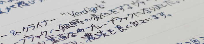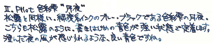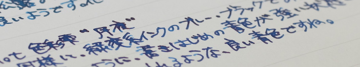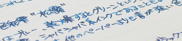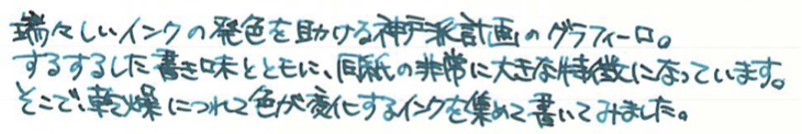 コラム:GRAPHILOと変色系インクについて Category:アナモノ Date:2014年11月16日 以前紹介した神戸派計画のグラフィーロ。インクの発色についてもう少し深く掘り下げて記事を書いてみようと思います。紙の表面を平にするために、コーティングまで施しているというこだわりよう。書いていてとても楽しい紙に仕上がっています。 写真とスキャナにはやはり色の差異がありますので、両方載せてみます。松露は言わずと知れた超の付く緑変インク。書き始めは好きなのに・・・なんて声もたまに聞いたりします。(わたしは緑変後の色の方が好きですが。)グラフィーロの特徴として、「まだ乾いてないのかな」と錯覚してしまうほどインクが瑞々しい色で定着するというものがありますが、色変化が激しいインクだとそれがより顕著に感じられますね。 月夜はわたしが始めて手にしたボトルインクで非常に思い出深いのですが、グラフィーロはそんな月夜の新たな一面を見せてくれます。 ヴァーディグリーズは思いのほか予想通りの色変化をしましたのでちょっと意外。もう少し緑色が強い状態で定着するかと思うとそうでもないようです。パーカーのXFという極細での筆記ですが、独特の濃淡は強く感じられます。 そして一番驚きだったのが、このレジストラーズインクの色。なんとも鮮やかなスカイブルーといった感じの色で、黒変する前はこんな色なんだなぁという素直な発見がありました。乾くとほとんど黒に近い色になってしまいますので・・・。ということで、素晴らしい書き味だけでなく、普段お使いのインクの新たな一面も発見できるグラフィーロ、ちょっとお高いですが是非御買い求めください。 PR