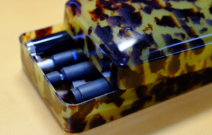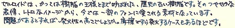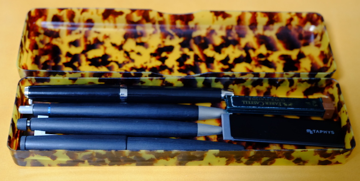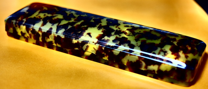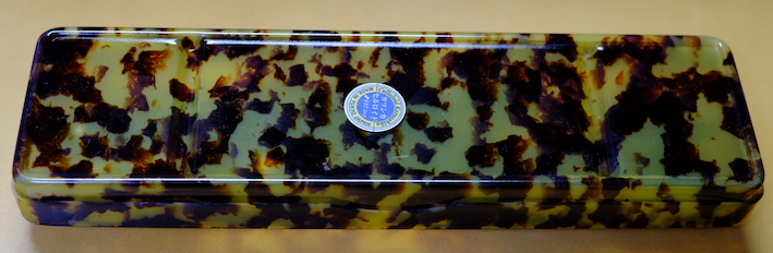 レビュー:カツシカセルロイド ペンケースL Category:アナモノ Date:2014年02月21日 やっと金曜日です。学生の頃は「花金」なんて何のことかサッパリ分からなかったですが 今となっては身にしみて感じます。こんばんわ、sepdectryです。 セルロイドは今となってはあまり見かけない素材になってしまいましたが、 本日はそんな、セルロイド製のペンケースをご紹介します。 セルロイドは史上初の熱によって変形させることが出来る人口樹脂です。 かつてはその性質と美しい艶から、象牙やべっ甲などの希少な自然素材の代用品として 一時代を築きました。主にペンケース、眼鏡、玩具などですね。 しかし、そんなセルロイドの黄金時代も長くは続かず、その発火性の高さが 主に米国で問題視され、市場から姿を消すことになりました。 現在はアセテート樹脂がセルロイドの代わりに多種多様な製品に使われています。 眼鏡はともかくとして、樹脂製の万年筆の軸も、今はほとんどがアセテートです。 葛飾区はかつてセルロイド製品の一大生産地だったらしく、現在も アクリルやプラスチック製品の製造が盛んらしいです。 セルロイドの良さ、歴史を再び発信していこうというモットーで 「カツシカセルロイド」の製品は作られているそうです。 以前はこういう箱形の樹脂製ペンケースはよく見る存在でしたが、 今はあまり見ませんよね。若い世代には逆に新鮮かもしれません。 裏面にはカツシカセルロイドのシールが。わたしはこういうシールは 真っ先にはがしてしまうタイプなのですが、今回はあえて残してあります。 使い込んでシールがぼろぼろになっても、それはそれで味ですよね。 うーん・・・美しいです。俗にいうべっ甲柄は今密かなリバイバルブームらしく、 眼鏡もクラシックなべっ甲柄のものが人気だったり、女性のネイルでも べっ甲柄のものがあるらしいです。流行は繰り返すんですねぇ。 アナログとデジタルの間で(仮)さまの記事にもありましたが、TWSBIの出すという セルロイド軸万年筆にはかなり期待しています。べっ甲柄も是非出してほしいです。 PR