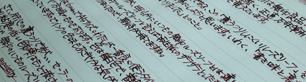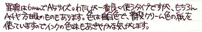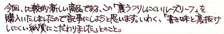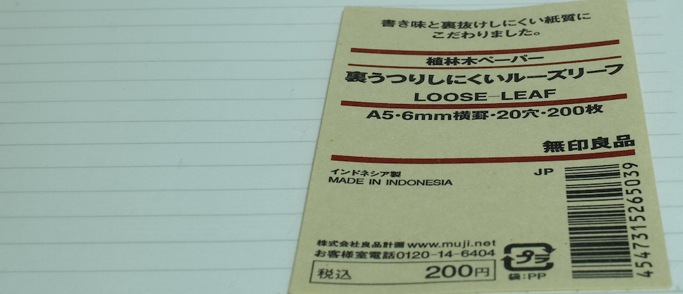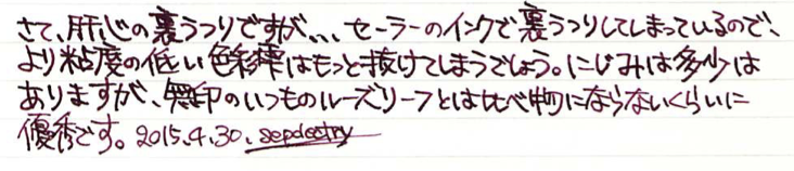 レビュー:無印良品 裏うつりしにくいルーズリーフ Category:アナモノ Date:2015年04月30日 久しぶりに紙モノのレビュー。大好きな無印良品から、ルーズリーフの生地を。学生時分から愛用している無印良品のルーズリーフですが、万年筆で、というよりもボールペンのシャープペンでの筆記がほとんどでした。 ボールペンとシャープペンでの筆記用途では大丈夫なのですが、ローラーボールや万年筆はちょっと、使えなかったですね。再生紙を使っていたこともあり、表面は結構ザラザラとしていましたし・・・。 無印良品は結構商品の回転サイクルが早く、これはずっとあるのだろうという定番品でも、いつの間にか廃盤やリニューアルになっていたりするので、気になるものはとにかく確保。 グラフィーロを初めて触ったあの日から、こんな手触りのノートがあるのか!とびっくりしてしまったわたしです。紙面と万年筆のペン先との相性は間違いなくあるので向き不向きで紙を変えたりしてしまいます。白色ですが、目に刺さるような感じはなく、ツバメノートのような目に優しい白色。この辺はナチュラルを標榜する無印良品の意地なのでしょうか。 まぁ、しょうがないとは思うのですが、「裏うつりしにくい」を商品名にするならもう少し・・・と思うのです。これまでの無印良品ルーズリーフよりは格段に進化していますが。 PR