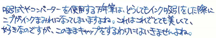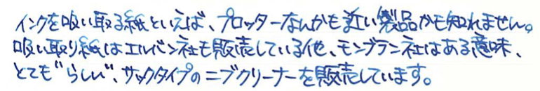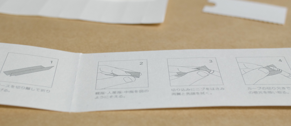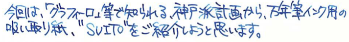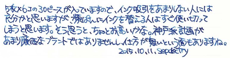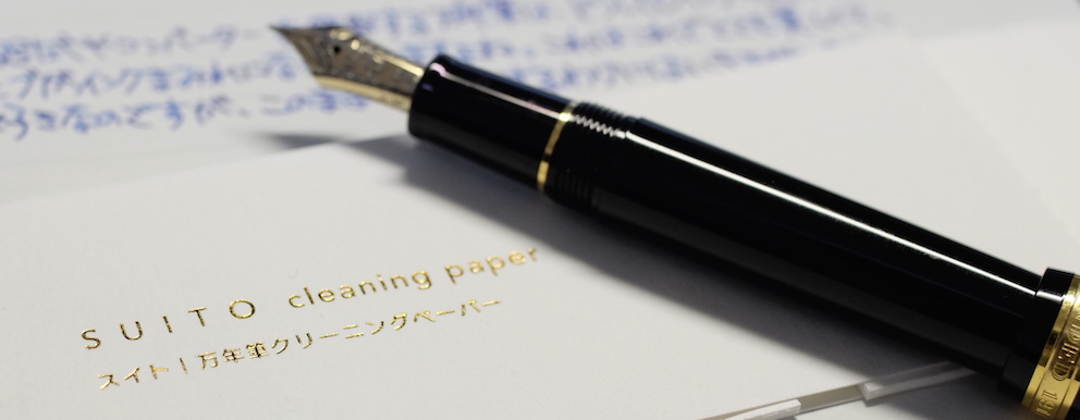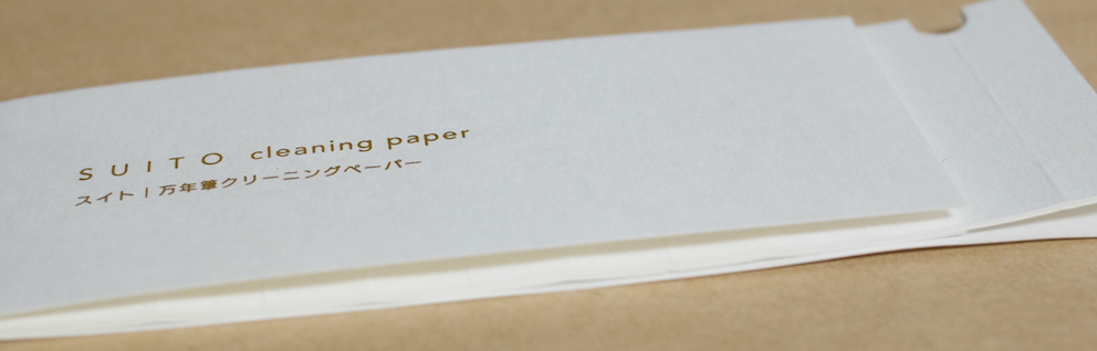 レビュー:神戸派計画 SUITO Category:アナモノ Date:2015年10月11日 グラフィーロに続いて、神戸派計画の記事第二弾。万年筆用の吸い取り紙、SUITOです。とにかく、紙にこだわった製品をラインナップしている神戸派計画さん。素晴らしい紙を使用したグラフィーロは本当にびっくりしました。あの滑らかさ、発色の良さは癖になりますね。 特に、この精緻な細工のプロムナードのニブが青墨にまみれている画は素晴らしく美しく、官能的とも言えるのですが、なにぶん顔料インクがべっとりなままキャップをする訳には・・・。 プロッターはインクを拭き取るというよりも、筆記時に余計なインクを吸い取ることで、早く乾くようにする道具ですね。モンブラン社のニブクリーナーは、本当にニブを拭くためだけの消耗品をここまでラグシュアリーにしてしまうのはさすが、という感じ。 このように使い方が書いてある紙がパッケージになっています。メーカーとしてはこのサイズはノートのしおりのように使うことも想定しているようですね。さすが吸い取り紙ということで、ティッシュなどでは残りやすいインクも、しっかり綺麗に拭き取ってくれます。 神戸派計画の製品ということで、常用するにはちょっと厳しい価格設定なのですが、この用途に使うには全くもって必要十分な性能で素晴らしい製品です。SUITOで吸い取ったインクを眺めるのも、また一興ではないでしょうか。 PR