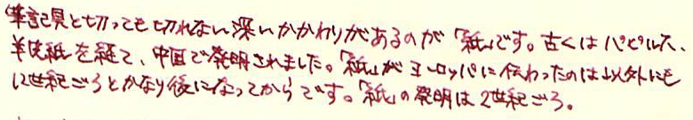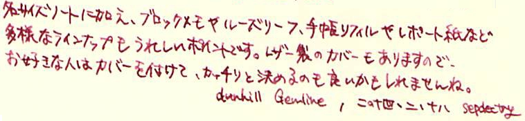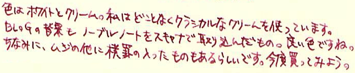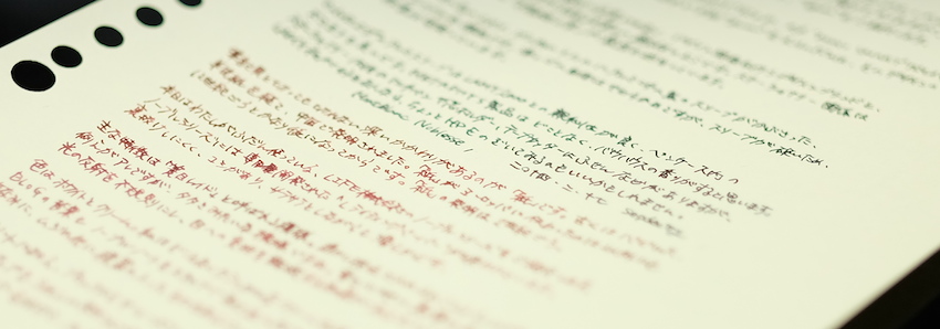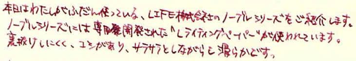 レビュー:LIFE株式会社 ノーブルシリーズ Category:アナモノ Date:2014年02月18日 記事を書いてから、「ノーブルなんだからノブレス使えばよかった」 ということに気が付いて若干後悔しているsepdectryです。こんばんわ。 パピルスが「paper」の語源になったのは有名な話ですね。 古代エジプトのパピルスが現存していたりするので、以外にも保存が効くものなんですね。 羊皮紙はその名の通り「皮」です。職人によって作られる高級品で、紙が伝わる以前に ヨーロッパ世界で使われていました。古い写本なんかは羊皮紙が使われていることが多いです。 ノーブルノートはわたしがはじめて手にした「ある程度高級な筆記用紙」であり その後にロディアも買いましたが、どうも愛着があります。 箔押しされたオレンジの表紙が洋書みたいでいいですよね。 写真は小さいものから 「ノーブルメモ」(B7) 「ノーブルリフィル」(手帳サイズ) 「ノーブルルーズリーフ」(B5) 「ノーブルルーズリーフ」(A4) です。 どうも右下に文がヨレる癖のあるわたしは、横罫の入ったものを使ったほうがいいかもしれません。 お札のように光にすかしてみると、この模様が「透かし技法」で入れられたものであることがわかります。 ツバメノートもそうですが、光を和らげて目を労わるようになっているんですね。 裏抜けはこんな感じです。白いものの上に置いてこの程度なら、万年筆を使う紙としては 十分合格点でしょう。裏面筆記もできそうです。 レザーカバーもエンボス加工で模様と「LIFE」の文字が入っていますので高級感はあります。 合皮なのが残念ですね。本皮ならわたしも買っていたかもしれません。 PR
