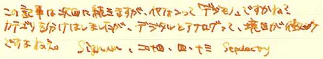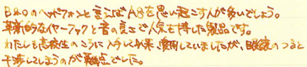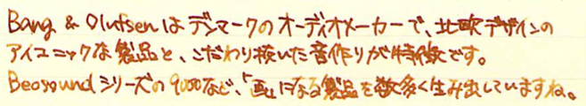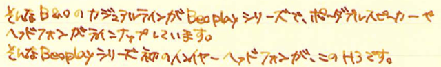 レビュー:Bang&Olufsen Beoplay H3 Category:デジモノ Date:2014年04月13日 本日は趣向を変えまして、イヤフォンのレビューです。イヤフォンというのは完全に趣味の世界でして、100円ショップのでいいやという人も居れば、ファイナルオーディオのピアノフォルテのようなとんでもないものを買ってしまう人もいらっしゃいます。このH3はミドルレンジといったところでしょうか。 9000はガラス張りのケースに6枚のCDを入れて、コントロールパネルを操作してアームを動かし、再生するCDを選択するというなんともすさまじい製品。ちなみに、価格もすさまじいです。 Beolit 12というスピーカーがAirplayに対応していて気になるんですよねぇ。値段が値段なので手が出ないのですが・・・。その他にも、H6というヘッドフォンがあったり、(このメーカーにしては)安価な製品をラインナップしています。 A8はイヤーフック付きイヤフォンの元祖とも言うべき製品で、洗練されたデザインが話題を呼んだベストセラーです。わたしも初めて持ったiPodと一緒に使っていました。もっとこだわる人は圧縮音源が云々、と始まるのでしょうが、わたし程度ならこれくらいで十分満足なのです。 わたしは正直言って、カナル型が好きではありません。遮音性が高すぎて違和感があるんですよねぇ。わたしにとって音楽は日常のBGM程度で良いので、完全に外音を遮断したくはないのです。このH3はカナル型ですが遮音性が高いとは言い切れない部分があり、これはB&O社の製品の一つの特徴とも言えるのかもしれません。 A8もそうですが、金属削りだしの精度の良い製品は何とも言えない美しさがありますね。SONYがZX1というとてつもないウォークマンを出していますが、こちらのデザインも割と好きだったりします。 ケーブルは1.35mと一般的な長さ。一度1mしかない製品を使ったことがあるのですが、どういうシーンを想定して作ってるんですかね。短すぎると思うんですが。音自体は非常に素直な音で、普段聞いている音楽にこんな要素があったのか!と新たな発見をすることが出来る感じ。こういう点は先輩のA8も一緒ですね。 例えばデジタル時計は完全にデジモノと言えるでしょうが、アナログ時計だと・・・?うーん難しい。とりあえずイヤフォンはデジモノだろう、ということで現在のカテゴリに入れました。 PR