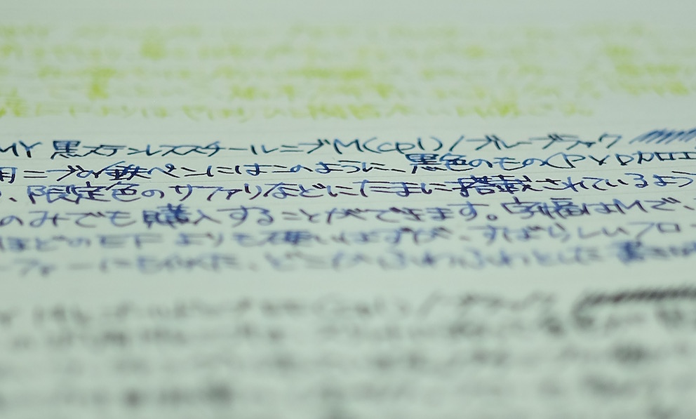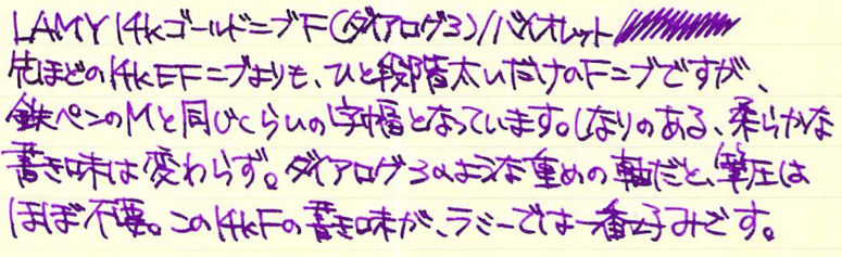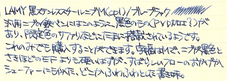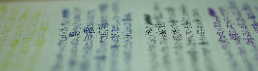 コラム:ラミーのインクとニブについて Category:インク Date:2016年03月19日 かなり前から用意していて、ずっと更新できていなかった、ラミーのインクとニブに関する記事。ようやく時間がとれましたので、ブログに書いています。 以前は白色のグラフィーロに書いて記事にしたチャージドグリーン。趣味文によると、日本ではチャージグリーンという名前で発売するようですね。アルスターのEFニブに入れています。多少煮詰まったのか、色が濃くなった印象。それでも、クリーム色のノーブルノートではやはり読みづらいですね。 ドのつく定番のブルーブラック。ラミーのインクの中ではとくに粘度が高いような気がします。濃淡のよく出る褪せた感じのブルーブラックで、フローの良い太字で書くと、鈍いレッドフラッシュが見られます。この黒ニブはとてもフローがよく、シェーファーの反りニブにような、ガチニブなのにあたりがやさしい、不思議な書き味。 これもドのつく定番のブラック。インクボトルが珍しい小型タイプ。かわいらしいですね。ラミーの14kニブは、ツイッターのほうでも何度も書いていますが、とてもすきな書き味。ステンレススチールニブとは、形が同じだけで全く異なる書き味で、素材がちがうだけでここまで印象が変わるのかと驚くほど。おすすめです。 バイオレットは他のインクと違い、カートリッジ専用の色。ボトルインクは販売されていません。つまり、ラミー唯一の吸引式である2000には入れることのできない色ということになります。ダイアログはインクのスキップに悩まされたのですが、不思議と、コンバータよりもカートリッジのバイオレットには合っている様子。万年筆とインクの相性は不思議ですね。このダイアログには14kニブのFが付いています。字幅も書き味も、とてもお気に入り。モダンなダイアログから、このふんわりと柔らかいニブが出てくるあたりが面白いです。 PR