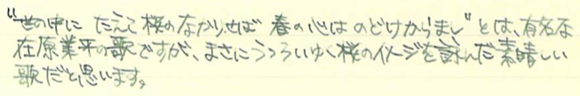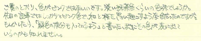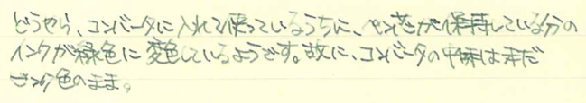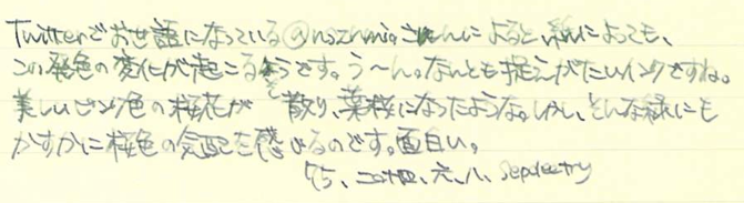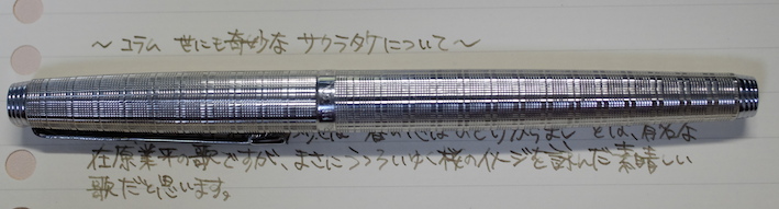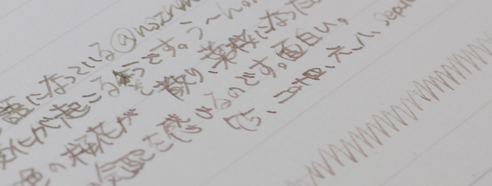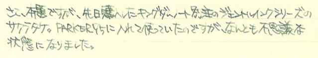 コラム:世にも奇妙なサクラタケについて Category:インク Date:2014年06月08日 読者の皆様のお陰で、A Pinch of inkは10000ヒットを達成いたしました。ブログを始めた頃は一日100ヒットもするなんて想像もできませんでしたが、これからも読みやすい記事と見やすい写真をモットーにがんばっていこうと思います。 現に、わたしも今年の花見は開花と天気の具合にかなり心折りまして、なんとか良い桜を見ることができました。日本人の心に深く刻み込まれた花だと思います。 勘のいい?皆様なら既にお気づきかと思います。あれ?サクラタケってピンク色のインクじゃなかったっけ?と。 前回の記事を見ると違いが顕著に分かりますが、全く色が違いますね。スキャナーの色表現は確かに実際の色とは違いますが・・・。 上の画像にあるとおり、コンバータの中のインクはピンク色をしております。ペン先に近い部分のインクが、空気と触れてピンクから緑に変化したのかな? ティッシュでインクを拭き取った後でしばらく置くと、にじみの端の部分が緑色になっていることが分かります。 と、長文を書いているうちに、またピンク色に戻ってきました。コンバータの中の変色していない部分が出てきたのかな?なんとも捉えどころのない、まさにきのこのような大変面白いインクです。 PR