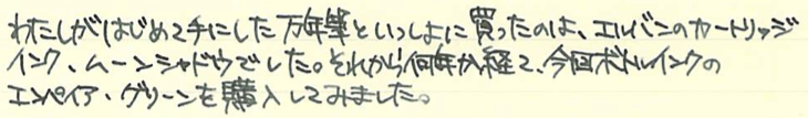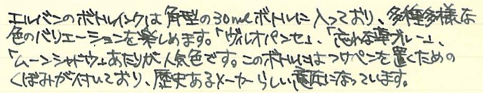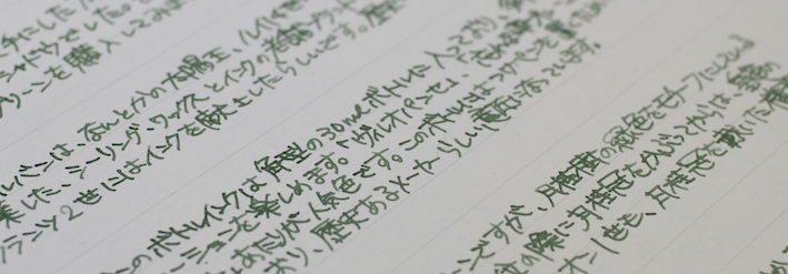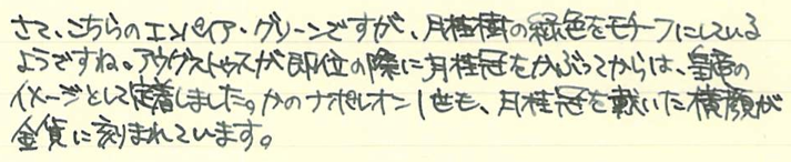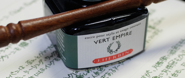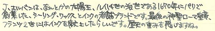 レビュー:エルバン エンパイアグリーン Category:インク Date:2014年12月27日 もう年の瀬ですね。2014年はこのブログをはじめたりと、いろいろあった年でした。来年もよろしくお願いします。vertは古フランス語で緑。empireはそのまま皇帝ですね。皇帝の緑。ラベルに月桂冠のイラストが描かれていることから、皇帝の月桂冠がモチーフだと分かりますね。 エルバンのカートリッジインクはレトロな縦型の缶に入っていて、万年筆を使う喜びを感じさせてくれます。ムーンシャドウはファーバーカステルのベーシックシリーズに入れたり、エルバンのインクローラーに入れたりして使っていました。 大航海時代に質の良い封蝋の材料が手に入るようになってから、パリで創業したエルバン。歴史の流れを感じるメーカーです。エンパイアグリーンの名もダテじゃないですね。 種類が多いこともあり、ものによっては在庫切れになっているインクもありますが、基本的には定番品はずっとあるようです。限定で華美なボトルにシーリングワックスで封がしてあるインクも出しています。 古代ローマは王政から共和制、帝政へと政体が変化したのですが、共和制下のローマでは王を嫌う風潮があり、かのユリウス・カエサルは自らを王として戴冠しようとしたために暗殺されたという話もあるほどです。アウグストゥスは自らをアポロン神になぞらえ、その象徴である月桂樹で冠を作り、王冠になぞらえたわけです。ここから、皇帝と月桂冠のつながりが始まるわけですね。エルバンのインクはあまりにじみはないのですが、ドライアップや煮詰まりに弱いので気密性の高い万年筆でお使いになることをお勧めします。煮詰まるとものすごくにじむようになってしまいますので・・・。 PR
