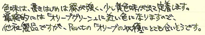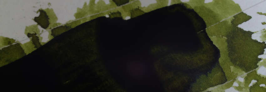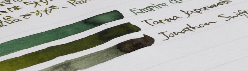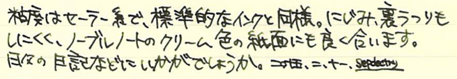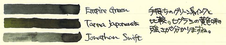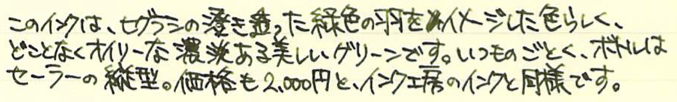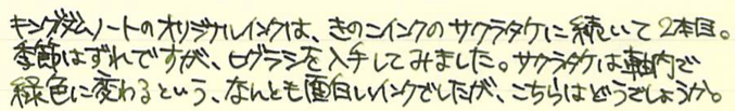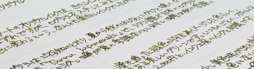 レビュー:キングダムノート別注 ジェントルインク ヒグラシ Category:インク Date:2015年02月11日 現在いわゆる繁忙期というやつでして、更新頻度はちょっと下がると思います。ツイッターは今まで通り反応いたしますので、よろしくお願いします。現在キングダムノートさまでは三種類のオリジナルインクが存在し、野鳥シリーズ、昆虫シリーズ、きのこシリーズの計15色。 サクラタケはなんとも不思議なインクで、コンバータにいれてしばらくすると緑色に変化するというつかみどころのない、きのこのような色彩です。このヒグラシはどうでしょうか。 ヒグラシは緑色のセミのイメージがありますが、山に近づくほど黒味のある色に変わるそうで、田舎の里山などでは黒っぽいヒグラシが鳴いているのかもしれませんね。郷愁を誘う、儚げな甲高い声が特徴で、気温が下がり始める夕暮れ時に鳴くことから、日暮らしの名前がついたとか。オリーブオイルのあの、綺麗な色のガラスボトルにそっくりの色です。Pentの万年筆は気になってはいるのですが、シュミットの鉄ペンなので躊躇ってしまいます。書き味が想像できてしまうので・・・。軸の生地は素晴らしいんですけどね。 スキャナーに通すとかなり色が褪せてしまうのですが、(たぶん紙面の色のせい)手持ちの二つのグリーン系インクとはまったく違う色で面白いです。スピナッチグリーン、オリーブグリーン、シーウィードグリーンといった感じ。 セーラーのインクくらいの粘度がちょうどいいと、最近は感じています。色彩雫はもちろん、濃淡が出て素晴らしいのですが、ノーブルノートですらときたま滲んでしまいますので・・・。 PR