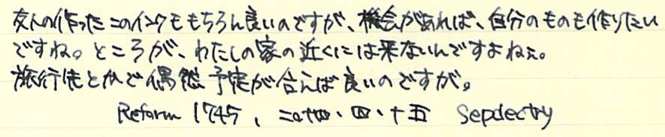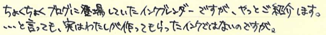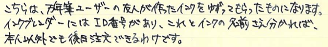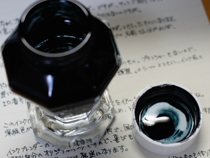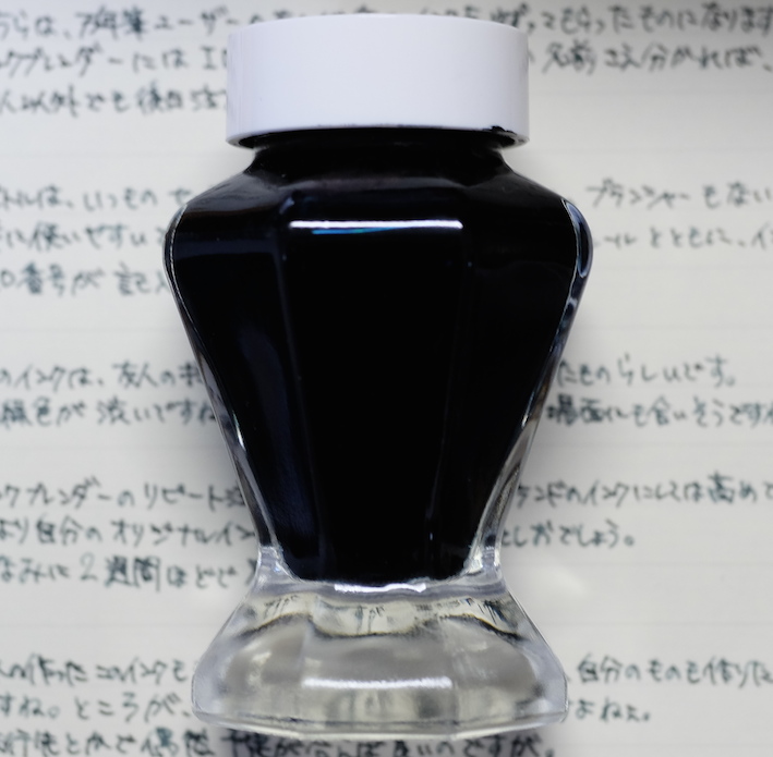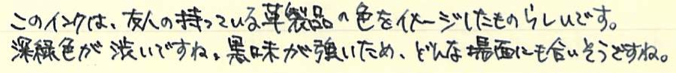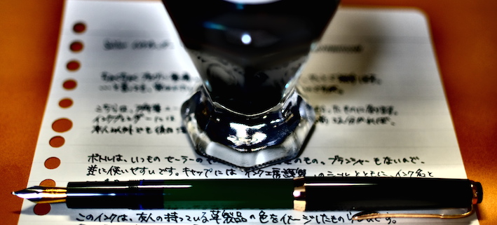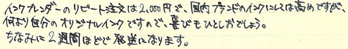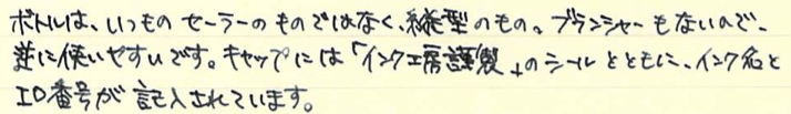 レビュー:セーラー万年筆 インクブレンダー Category:インク Date:2014年04月15日 わたしの筆箱は、ペンシル、マルチペンはラミー2000で決まっているのですが万年筆はその日によって違うものを持っていっています。メモ帳が日によってカラフルになって面白いのでおすすめです。 セーラーのインク工房はぜひとも参加してみたイベントです。案はいろいろ考えてあるんですよねぇ(笑 以前はノブレスに入れていたインクがこちらです。今はReform1745で使用しています。 おそらく、あまり推奨されてはいない買い方だと思います。原則オリジナルインクを作った本人のためのサービスでしょうしね。 限定インクなどで使われている縦型のボトルです。こっちの方が好みだなぁ。 色味は、おそらくとても黒に近い青緑といった感じでしょう。遠目で見ると黒にしか見えないかもしれません。乾くと緑が出てきます。 インクの調合の手間を考えると、2000円は相当お得だと思います。二週間という納期も、かなりギリギリのところだろうなぁ。 夏頃に名古屋に滞在する用事があるので、そのときに来ないかなーと期待しています。 PR