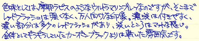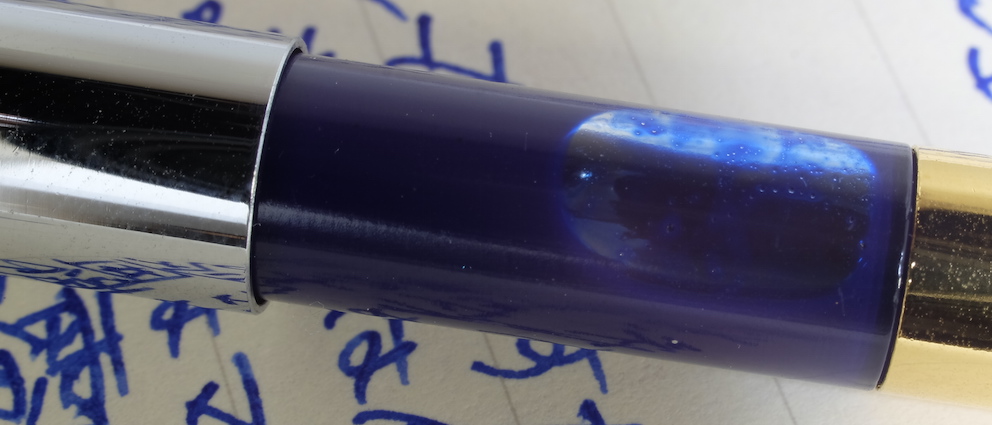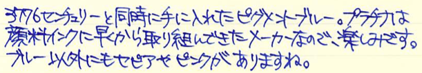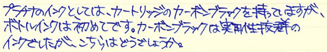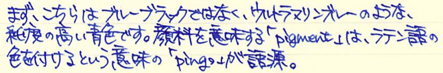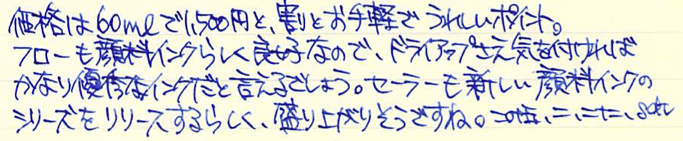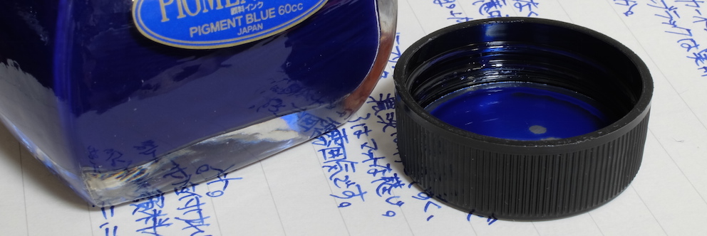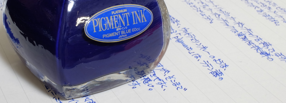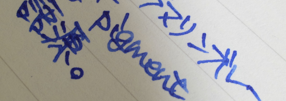 レビュー:プラチナ万年筆 ピグメントインク ブルー Category:インク Date:2015年02月22日 日頃思うのですが、インターネットの進歩はすさまじいですよね。離れていながらにして同好の士と会話や情報交換できるのは素晴らしいです。にわかに盛り上がりをみせる万年筆用顔料インクの世界。本日はプラチナのブルーをご紹介。 顔料ブランセピア、顔料ローズレッドなど、なんとも特徴的な色をラインアップしているプラチナ。スリップシール機構によほど自信があるのでしょう。カーボンブラックはまさに黒!黒!という感じ。かなりギラギラしたインクで、乾燥したかどうかがちょっと分かり難いインクでした。 ブルーブラックなセーラーの青墨とはうってかわって、こちらはまさに「ブルー」。 レッドフラッシュは好みの分かれる点で、好きな人もいれば、なるべく赤光りしないブルーインクを・・・という人もいらっしゃいます。このピグメントブルーは若干のレッドフラッシュが感じられますね。カーボンブラックのようなぎらつきはないです。 セーラーの新顔料インクシリーズはストーリアという名称のようです。ストーリアといえばダイハツの普通車を想像してしまうのですが・・・。発売が楽しみですね。 PR