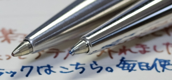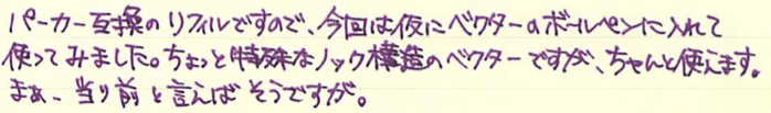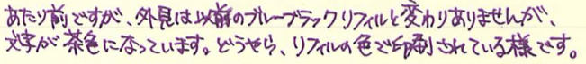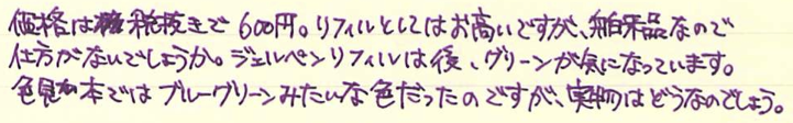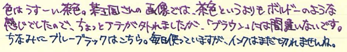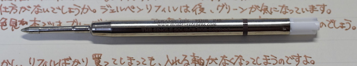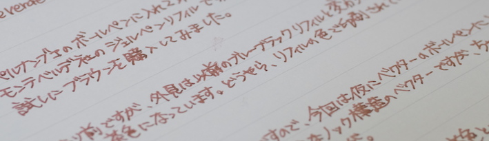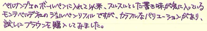 レビュー:モンテベルデ ジェルペンリフィル ブラウン Category:インク Date:2014年05月13日 人間の睡眠時間は何時間が一番良いのでしょうか。社会人になってからだいたい7時間睡眠なのですが、もう一時間あればなぁと思うことが結構あるんですよね。寝過ぎですかね? まず最初にお断りしておきます。今回のレビューの手書き画像の色は全く当てになりません。なにやら紫のような色になってしまっていますが、実際はちゃんとブラウンです。 元々はブルーブラックのパーカー互換リフィルを探してたどり着いたモンテベルデのジェルペンですが、すっかりその書き心地のとりこに。 上の写真の文字の色が実際のイメージに近いです。全然スキャン画像と違いますよね。蛍光ペンの色を読んだり読まなかったりは仕方が無いと思っていたのですが、こういう淡い混色系も苦手なんだなぁ。ノックでも、回転繰り出しでもしっかりと使えますし、ペン先の露出具合も丁度良いと思います。他社互換のリフィルの、こういう細かな精度って意外と気になるものですよね。 ご覧の通り、セラミックボールはインクの影響でブラウン色になっています。かわいいですね。現状、筆圧が強めのわたしですが、ブルーブラックで特に問題は起きていません。国産の極細ボールペンだとすぐにダメになるんですよね。 水性ジェルインクの筆跡ですね。パーカー互換のジェルインクでは随一のカラーバリエーションがありますので、気に入った一色が見つかると思いますよ。 そのうち、リフィルを入れるために安いボールペンを買ったりしてしまうのでしょうか。気になるパーカー互換のボールペンが何個かあるんですよね。 PR