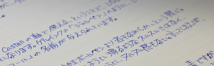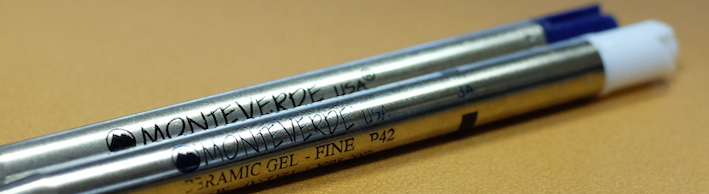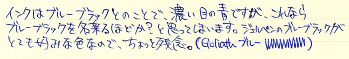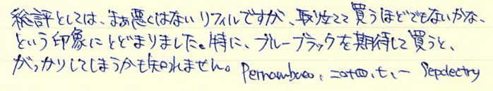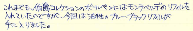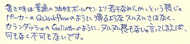 レビュー:モンテベルデ ソフトロールリフィル ブルーブラック Category:インク Date:2014年07月01日 モンテベルデの筆記具を持っていないのにリフィルだけは何本も買っています。他社が出していない珍しい色展開をしていて、気になるんですよねぇ。 ブルーブラック沼の住人であるわたしは、ボールペンまでもブルーブラックにしたいのですが理想のリフィル探しに奮闘しています。現在のところ、モンテベルデのジェルペンリフィルのブルーブラックがナンバーワンなのですが、紙面をかなり選ぶのがネックです。 硬い机でノーブルノートに筆記するのなら、ジェルペンリフィルは理想なのですが、ざらざらした紙面だと途端にインクの出が悪くなります。新品のリフィルでも同様なのでインク残量の問題ではなく、製品としての特徴なのでしょう。 ソフトロールというと、柔らかいロールパンを思い浮かべてしまうのはわたしだけでしょうか。 言うならば、クインクフローとゴリアットは油性ボールペンリフィルのなかでも、かなり特徴的な部類に入る書き味ですので、この二者と比べるとどうしても無個性に感じてしまいます。が、このソフトロールの神髄はカラーバリエーションの多さにあります。 こちらのブルーブラックはともかくとして、パープル、オレンジ、ブラウン、シルバーなど油性ボールペンでは見かけないようなざまざまな色が展開されています。さらに、リフィルの形状もこちらのパーカー互換から、モンブラン用、シェーファー用、ウォーターマン用などなど、これでもかと言わんばかりの種類の多さ。 あくまで、このブルーブラックのリフィルとしての感想なので、今回はある程度辛口に評価することになってしまったのですが、豊富な色展開のなかで、ピンとくる色があった場合はそれを様々なタイプのボールペンで使用できるという点で、優れた製品であることを付け加えさせていただきます。(リフィルの入手性の問題もありますが・・・。) PR