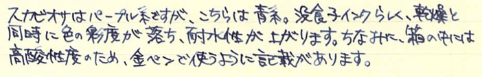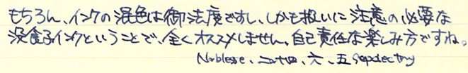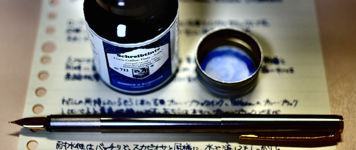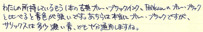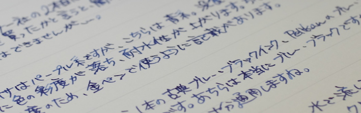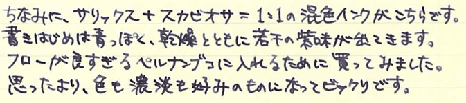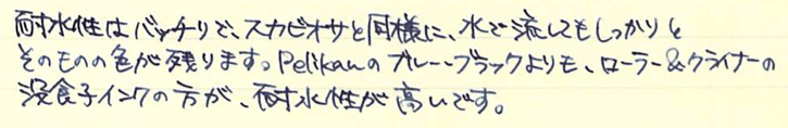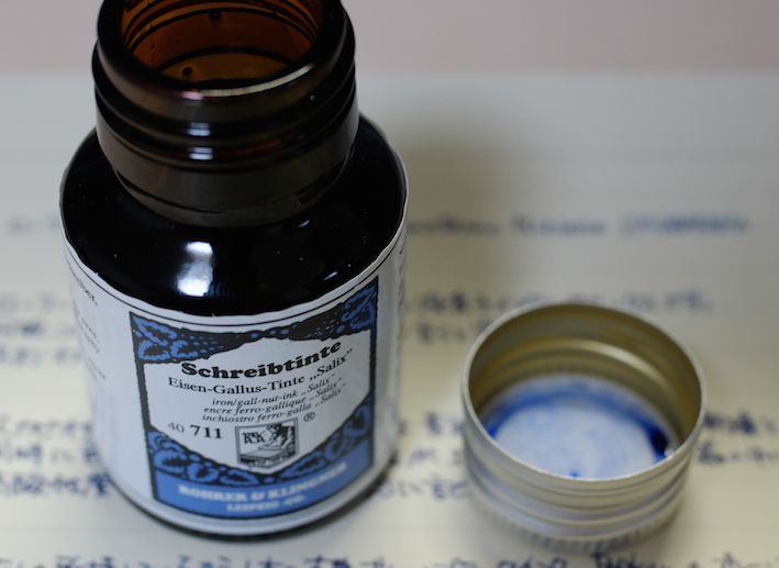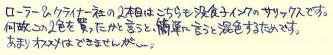 レビュー:ローラー&クライナー サリックス Category:インク Date:2014年06月05日 ようやく、というかやっと日本が梅雨入りし始めましたね。雨は嫌ですが、梅雨が無ければ無いでいろいろなところにしわ寄せが行ってしまうのです。 二回連続でローラー&クライナー社のインクのレビューになってしまいました。本日はスカビオサに続き、没食子インクのサリックスです。 ミックスフリーなどの混色を目的として作られた一部のインクを除いて、インクの混色はたとえ同社同シリーズの製品であっても不慮の問題が発生してしまう可能性がありますので、全くお勧め出来ません。 モンブランもラミーも古典で無くなり、相対的に貴重になっていく没食子インクですが、ローラー&クライナーのサリックス、スカビオサのような没食子を売りにしているような製品は、このままでしょうからある意味安心です。 濃淡が出るインクですので、色の薄いところは奇麗に青が出ています。今回は細字の万年筆で書きましたが、太字で書くとまた違う味が出る気がしますね。 瓶は深い茶色で、化学で使う薬瓶のような独特の雰囲気があります。スカビオサとサリックスに関しては、酸性度が高いので、薬瓶に入っていても不思議じゃないイメージですが(笑 某王国さまのインクボトルにはスポイトが付いていますので、インクを移し替える際も便利で良いですね。哺乳瓶みたいでかわいいです。 金ペンといえども、社外品の、しかも没食子インクを混色して使うなんていうのは最も負担が大きいでしょうし、ちょっと心配ではあります。トラブルの対策は、実際に使い倒すのが一番でしょうから、どんどん書いて行こうと思います。 PR
