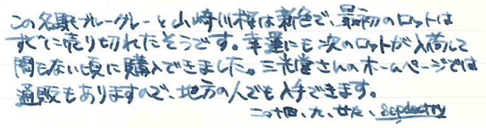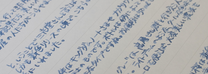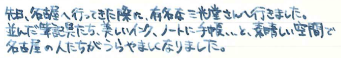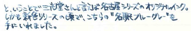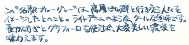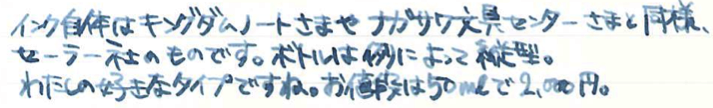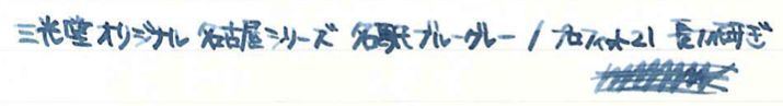 レビュー:三光堂オリジナル 名古屋シリーズ 名駅ブルーグレー Category:インク Date:2014年09月29日 先日、ふとボトルインクを並べて入れている箱を見てみると、ちょっとびっくりするくらいインクがいっぱいありました。これがインク沼というやつなんでしょうか。と、いいつつも今日はインクの記事だったりします。モノは名古屋の文房具屋さん、三光堂さまのオリジナルインク、名駅ブルーグレー。わたしの田舎で万年筆に触れる場所なんて百貨店の文房具コーナーくらいですし、オリジナルインクを作っているくらいの規模の個人の文房具屋さんなんてまさに夢の空間でした。軸を一本買おうか迷ったのですが、持ち合わせがなく断念。 最近はオリジナルインクを取り扱っているお店が増えましたね。以前はオリジナルインクと言えばナガサワ文具センター、と言った感じでしたが、今では数えきれないくらいのお店で数えきれないくらいのオリジナルインクが販売されています。 といっても、ほとんどのオリジナルインクがセーラー社のもので、例外としてカキモリさまで混色可能なプライベートリザーブ社のインクをブレンドして販売しているくらい。プライベートリザーブのインクはわたしも気になっているので、近々入手予定です。 スキャン画像ではちょっとグリーンが強く出ている気がしますが、実物はもっとすっきりとクールなブルーグレーです。写真の方がイメージに近いと思います。 こんなお店が近くにあったら、用もなく入り浸って散財してしまいそうなくらい、魅力的なお店でした。旅行の際に文房具屋さんを探してみるのも良いですよね。 PR