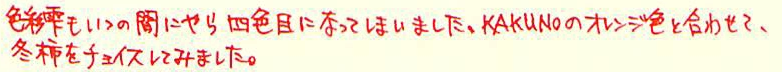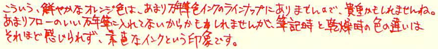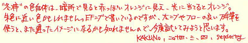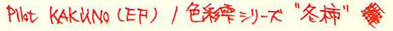 レビュー:色彩雫 冬柿 Category:インク Date:2014年03月04日 家にも渋柿の木があって、以前は取り残しの柿がぽつんと枝に残ったりしていたのですが、 この間切ってしまいましたので、本物の冬柿をみることは出来なくなってしまいました。 と、いうことで、KAKUNOにはキャップ色のイメージとあわせて色彩雫の冬柿を入れました。 月夜、霧雨、竹炭、冬柿・・・。次は何を買ってしまうのでしょうか。 ブルー系もいいですが、ブラウンもパープルも気になるんですよねぇ。 ボトルはいつもの色彩雫ボトル。増えてくるとインテリア的にもいい感じですよね。 他の方のレビューだと、「オレンジから朱色に変わる」ということなので、 今度別の軸に入れて試してみようと思います。 エラボーでcon-70を使っています。今回con-50を使ったので、 残すはcon-20のみですが、20しか使えない軸ってあるんですかね? ビンテージものだと20しか使えなかったりするのかな?その辺は詳しくないのです。 趣味の文具箱、発売しましたね。早く手に入れたいのですが、本屋に寄る暇がないのです。 今度のお休みに買いにいこうかな・・・。 PR