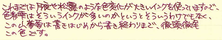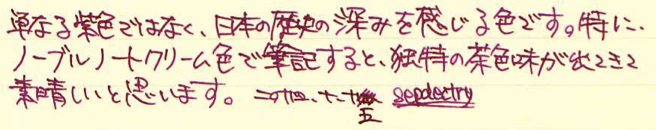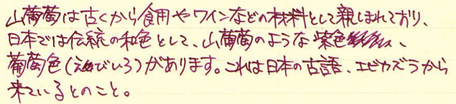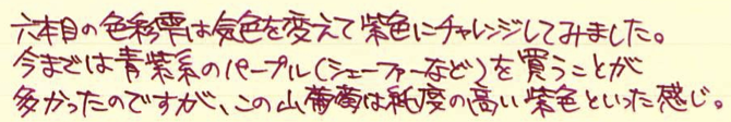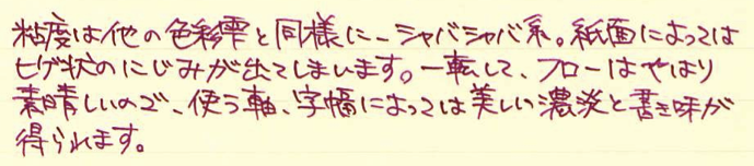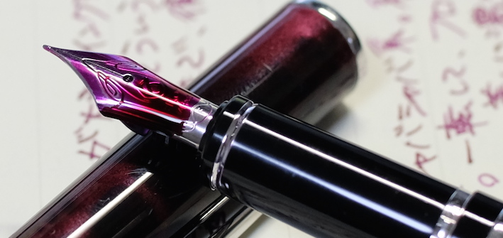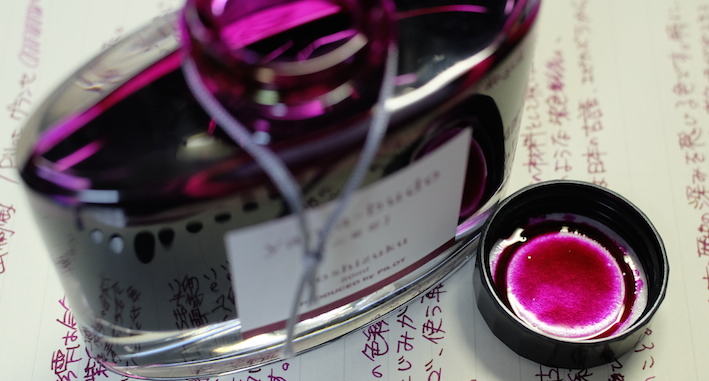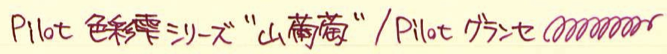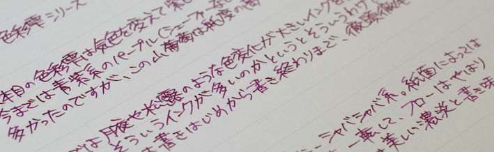 レビュー:色彩雫 山葡萄 Category:インク Date:2014年10月15日 パイロットの色彩雫シリーズは海外でも人気で、「Pilot Iroshizuku Ink」として販売されています。わたしのよく利用するcultpensさまでも売られており、本日ご紹介する山葡萄は、「Crimson Glory Vine」となっています。調べてみると、「Crimson Glory Vine」はそのまま、山葡萄の英名でした。イギリスの有名な薬草園でも栽培されているほど、栄養価が高い果物です。ブルー系は月夜、松露。モノクロ系は竹炭、霧雨。オレンジ系の冬柿に、この山葡萄と一番最初に月夜を買ってから、だんだん色彩雫も増えてきました。考えてみれば、この世界に足を踏み入れるきっかけも月夜だったので、感慨深いものはあります。 色の系統の似たインクとして、色彩雫の躑躅がありますが、こちらはピンク系。山葡萄は落ち着いた印象のパープルですが、躑躅は派手なピンク色のようです。 同じくシャバシャバ系のエーデルシュタインも非常に味わい深い濃淡が出ますので、やはり粘度の低いインクの方が、にじみやすい分濃淡が楽しめるのでしょうか。 まさにこの山葡萄の色は和色の「葡萄色」に近く、外国圏でいう、「ワインレッド」や「バーガンディ」に近いようです。この葡萄色を少し茶色目にした「葡萄茶」やさらに赤みを強くした「紅葡萄茶」なる色もあるようです。 古来から日本では紫色は高貴な色として扱われてきましたので、レトロな色味のクリーム色系のノートで使うとより色が映えるような気がします。 PR