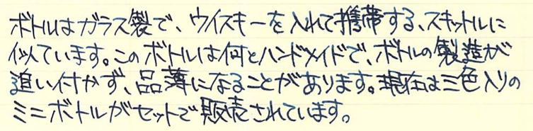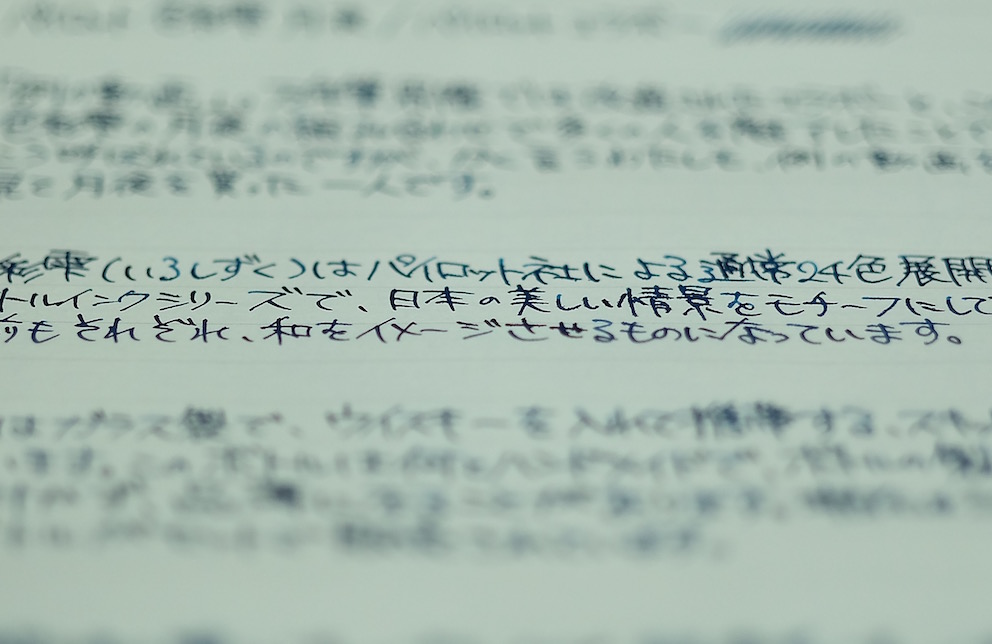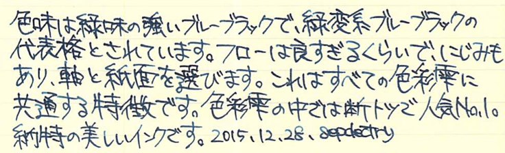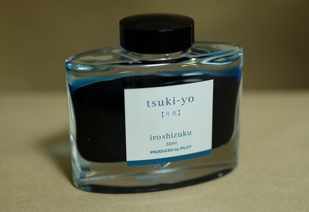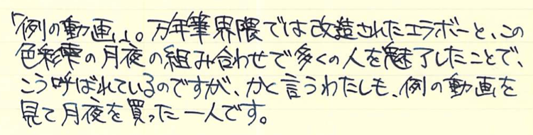 レビュー:色彩雫 月夜 Category:インク Date:2015年12月28日 その詩的な美しさで、そのものが大人気の色彩雫シリーズの、堂々人気ナンバーワンに君臨する、「月夜」。ほかの色を扱っていないお店でも、月夜は売っている、ということも。 海外の動画ですが、「例の動画」で通じてしまうほど有名になったのが、改造したナミキ・ファルコンをフレックスさせ、月夜を使って美しい文字を書いていく動画。一時期はエラボーも月夜も品薄になってしまうほどの影響力がありました。 実は、東京限定でもう3色あったらしいのですが、現在は手に入れることはできません。ちょっと残念ですが、それでも万年筆用インクで24色というのはとんでもないラインナップの多さ。かなりインク沼にはまっている方でも、まだ持っていない色がある、という方も多いでしょう。 もともとはミニボトルセットは限定販売だったらしいのですが、現在は好きな3色を選び、きれいな化粧箱に入れて送ってくれるそうで、これでずいぶん敷居が下がったような気がします。美しい色々を手軽に楽しめるのもいいですね。 同じく、色彩雫の「深海」とは趣の違うブルーブラックで、他のメーカーでいうと、ウォーターマンのミステリアスブルーや、ヤードオレッドのブルーブラック、セーラー万年筆の青墨のような、緑味の強いブルーブラックになっています。また、筆記時は青が強く、乾くに連れて緑が強くなる、緑変が見られるのも特徴。クリーム色のノーブルノートで筆記すると、これがまた月夜、といった感じでとても美しいのでオススメです。 PR