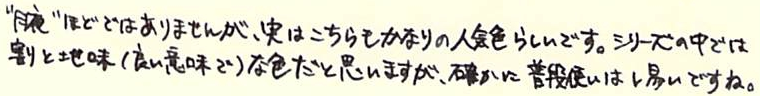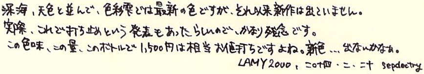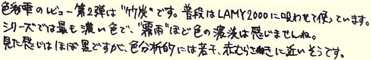 レビュー:色彩雫 竹炭 Category:インク Date:2014年02月20日 全く関係のない話なのですが、一週間が七日間なのは絶妙なバランスだと思います。 時間関係は24時間だったり12ヶ月だったりと十二進法関係が多いのですが、 もし一週間が十二日間だったら確実にダレてる気がします。こんばんわ、sepdectryです。 本日は色彩雫シリーズから、竹炭をご紹介します。 いつ見ても色彩雫のボトルはいいですねぇ。底の形状が最後まで インクを吸いやすいように絞られているのがデザイン上も良い効果を生んでますね。 このボトルに入って1500円は・・・安いなぁ。 舶来品のボトルインクなんてこれの倍以上するのがザラにありますからね。 霧雨もいつかレビューしようと思います。竹炭はブラック!と言った感じで、 乾く前はまさに黒色ですが、乾いたあとに若干色が変化します。 乾く前がこちら。乾いたあとが・・・ こちら。赤みがかってるのが分かりますね。 趣味の文具箱さんのインク色分布では、真っ黒より若干赤紫寄りとのこと。 職場で使っても何ら違和感ありません。水で流れるのは問題かもしれませんが。 昔は万年筆やデスクペンがフォーマルな場で大活躍してたらしいですね。 2012年にこの三色が出たっきりなんですよね。 Pilot社的には色彩雫シリーズは大成功商品でしょうし、ファンは期待してしまいますが あまり色を増やしすぎて、逆に廃盤を出してしまっても面白くないですものね。 この辺のバリエーションが実はちょうどいい数的バランスなのかもしれないですね。 PR