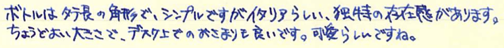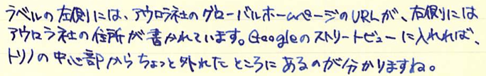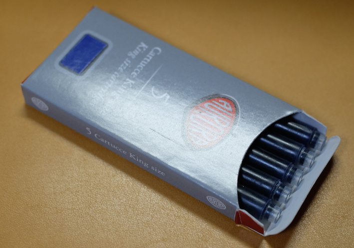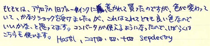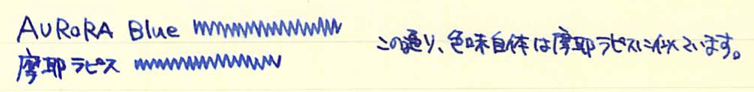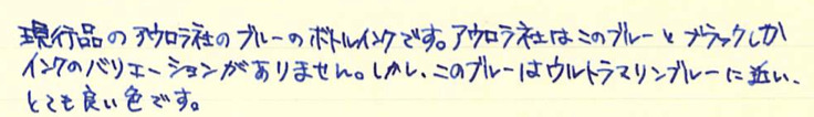 レビュー:AURORA Blue Category:インク Date:2014年04月14日 先日びっくりの原因になったアウロラブルーのボトルインクをご紹介します。 イタリアで青といえば、チェレステを想像してしまうのはわたしが自転車乗りだからでしょうか。チェレステはターコイズブルー的な色味ですが、このアウロラブルーはどうでしょうか。 ブラックもカートリッジインクを持っているのですが、まだ通してないんですよね。これでもか!という感じの黒、という話を耳にしたことがあります。 香水の瓶のような、かわいらしい雰囲気があります。インクボトルは安定性の面で、横長のものが多めなのですが、縦長もいいですよねぇ。 それでも、カランダッシュや伯爵コレクションと比べれば全然安いんですけどね。インクに4000円はおいそれと出せないよなぁ・・・。 カートリッジインクはこんな感じ。色はおそらくボトルと一緒でしょう。会社のアドレスが書かれたインク瓶というのはなかなか新鮮ですね。ストリートビューの見た目的に、工場かな?という感じですが。 ご覧の通り、色味はインク物語の摩耶ラピスに近いです。というか、並べてみてもほとんど違いが分からないのです。見る人が見れば・・・うーん。 アウロラ社おすすめのドクターヤンセンも良いのですが、現在輸入がストップしているようでどこも在庫切れなんですよねぇ。気になるので手に入れたいところなのですが・・・。 PR