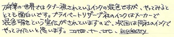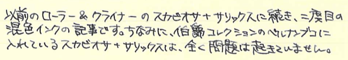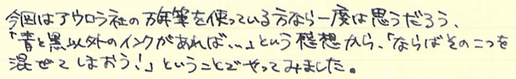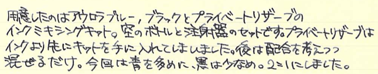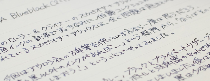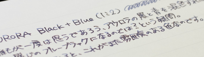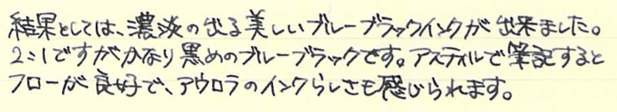 レビュー:AURORA Blueblack(混色) Category:インク Date:2014年11月27日 以前のスカビオサリックス(仮称)に続き、混色インク第二弾です。混色インクはプラチナのミックスフリーやプライベートリザーブ以外は推奨外なので、自己責任になります。希望的観測になりますが、おそらくそこまで深刻な問題は起きないと思います。スカビオサリックスを作ってからおよそ半年。ずっとペルナンブコに入れて使用していますが問題は特に起きていません。今後も起こらないだろうなと勝手に思っています。 アウロラ社のインクはブルーとブラックのみの二色展開。美しい樹脂を使った軸を数多く作っている同社ですから、インクももっとバリエーションがあればなと思っている方も多いかと思います。ホームページ上ではドクターヤンセンのインクの使用をお勧めしているということで話題になったりもしました。 しかし、ドクターヤンセンのインクは国内ではどこも品薄状態で購入が難しいです。そこで、ブルーも良い色、ブラックも良い色なら、混ぜても良い色だろう!という単純な理由でアウロラのインク二つを混ぜてみることにしました。 ノーブルノートとグラフィーロで筆記してみましたが、アウロラらしい深みのある良い色です。特に白色のグラフィーロ上では濃淡がくっきりと出て、まるでオールドノリタケのボーンチャイナ、「アドリアンブルー」のよう。名前を付けるとしたらこれがいいですね。そもそも、ミックスフリーやプライベートリザーブのような、メーカー側で混色を推奨しているインクとそうでないインクにはどういう違いがあるのでしょうかね。色の基になる物質が混色によって化学反応を起こして云々・・・という話も聞きますが。あくまで自己責任で楽しむのが良いと思います。 PR