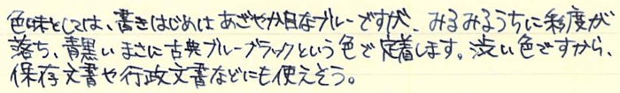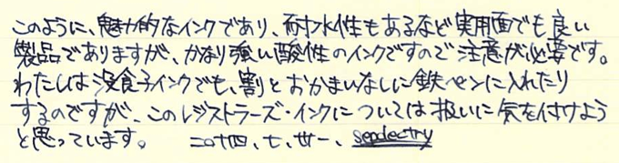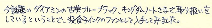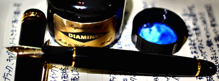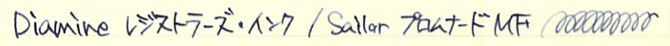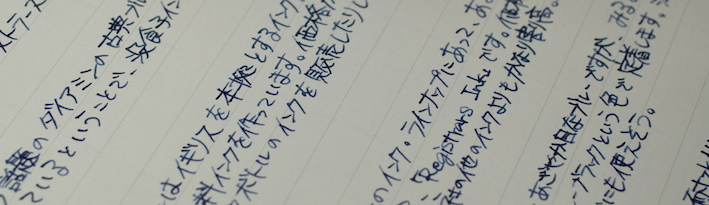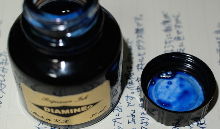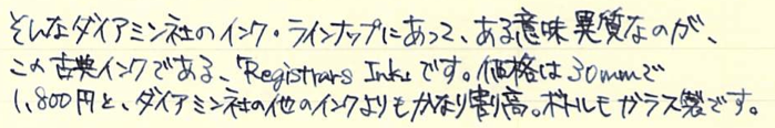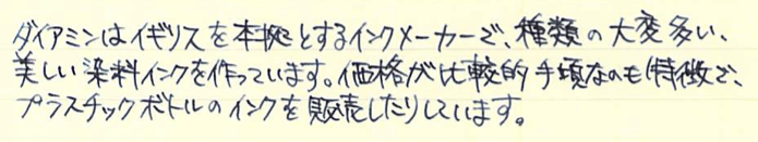 レビュー:ダイアミン レジストラーズ・インク Category:インク Date:2014年07月31日 ペリカンのブルーブラックを始めて買ってから、没食子インクをいろいろと手に入れています。今回は没食子インクの中でもかなり古風な作りをしているというダイアミンのものをご紹介します。没食子インクはやはりブルーブラック系の色が多いですね。ローラー&クライナーのスカビオサのような珍しい色もあるにはあるのですが。他の色は作りにくいのでしょうか。 ダイアミンのインクをナガサワ文具店でも取扱い開始したということで、今後は手軽に楽しめるようになると思います。こちらのインクも、もっと量の多いボトルがあるらしいです。プラスチックボトルのインクは30mlで税抜600円と、なんともお得な値段です。舶来のカートリッジインクでも同じような値段のものがありますので、どれだけ御安いか分かります。 レジストラーは英語で記録官を意味する単語で、まさに長時間保存の必要な文書に使用する没食子インクにぴったりの名前になっています。値段が高くなっているのはそもそもインクを作る手間と、ボトルの素材もあるでしょう。 色の方向性としてはペリカンのブルーブラックと似ていますが、書き始めのブルーから彩度が落ちるスピードは目で見て分かるほど早いです。乾燥も早いですし、裏抜けもありません。実用インクとしては優秀だと言えるでしょう。 流水にさらし、水を含ませた後に拭き取ったのがこちらの画像。しっかりと色が残っています。他の没食子インクでは、おそらく発色させるために添加された染料が水で流れて色が抜けていたのですが、レジストラーズ・インクはそれすらもあまりありません。伝統的な製法で作られた実用性の高いインクですが、扱いには注意が必要です。使用する際は、こまめなメンテナンスとニブの材質に注意です。 PR