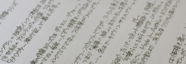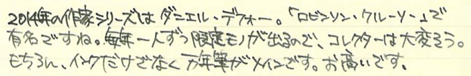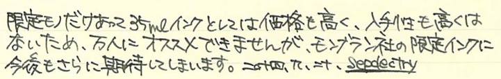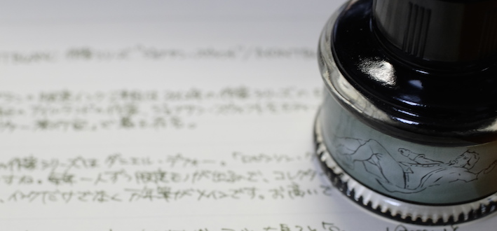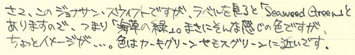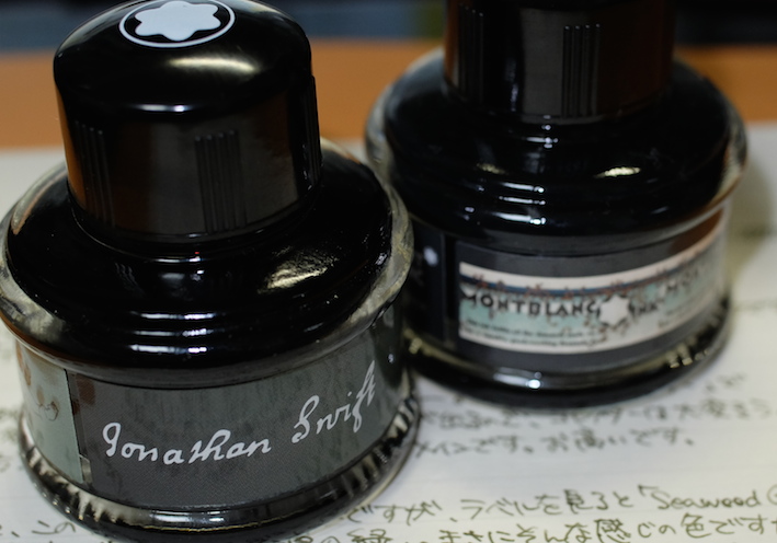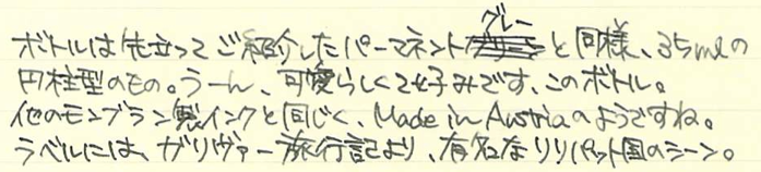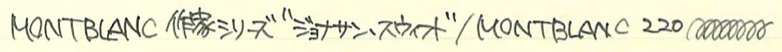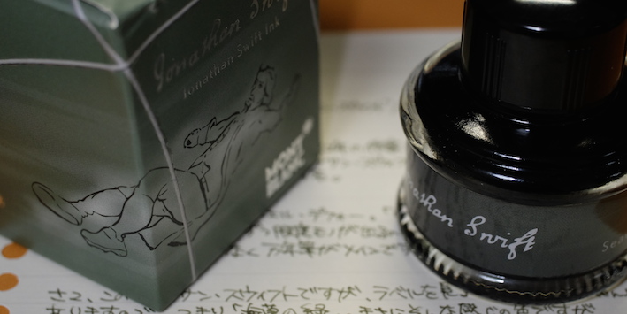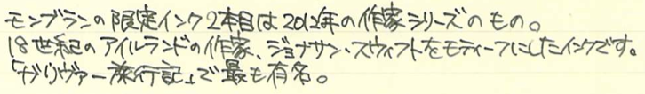 レビュー:MONTBLANC ジョナサン・スウィフト インク Category:インク Date:2014年09月20日 二夜連続でモンブランの限定インクの記事になります。今回はジョナサン・スウィフト。作家シリーズはモンブランの限定シリーズの一つで、各国の著名な作家をイメージした万年筆とインクがセットで発売されています。 小人国が有名なガリヴァー旅行記ですが、実は日本も登場しています。しばらく滞在した後「Nangsac」から出港・・・。これはおそらく長崎のことでしょうね。 現行のモンブラン社の万年筆には、今のところ興味がありませんので入手するつもりはありません。オールドモンブランには何点か気になるのがありますので、そのうちご紹介出来ると思います。 確かに、ワカメや海苔ってこんな色ですよね。書き始めはブラウンが強いですが、乾燥するにつれてグリーンが顔を出しています。 カヴェコのリリプットも小人国がモティーフなので、このインクを使うのも面白いかも知れません。適合するコンバータが存在すれば、の話ですが・・・。 ブティックでとりあえずあるインクを全部出してもらって、チョイスしたのがこのインクでした。デフォーもあったような・・・買っておけば良かったな。 PR
