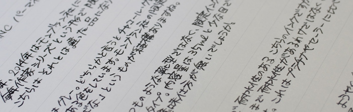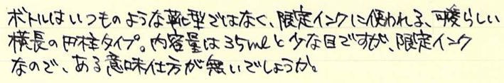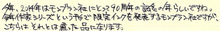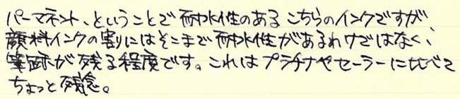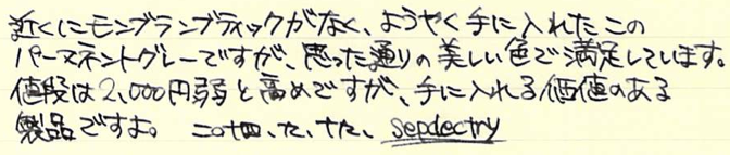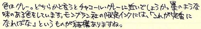 レビュー:MONTBLANC パーマネントグレー Category:インク Date:2014年09月19日 と、いうことで帰って参りました。お久しぶりです。モンブランブティックに行く機会があり、手に入れた限定インク、パーマネントグレーのご紹介をいたします。パーマネントは「恒久的」を意味する英単語。万年筆の世界では耐水、耐光性のあるインクに使われることが多いです。古くは没食子インク、最近は顔料インクでしょうか。 モンブラン社ではなく、マイスターシュテュックにとって、が正しいみたいです。箱もラベルも、優美ですがどことなく異国的なデザインで美しいですね。 モンブランの限定シリーズは、流通終了後に再生産が出来ないようにレシピを破棄してしまうらしいですね。価値を高めるためでしょうが、もったいないなあと思ってしまいます。 一緒に手に入れた、作家シリーズジョナサン・スウィフトのインクもこのタイプのボトルです。コラム型のかわいらしいボトルで、ちょっとお高めですが所有欲が満たされるデザインになっていますね。 耐水性としては、ペリカンのブルーブラックと同じように、色素は流れ出ますが筆跡は残るタイプ。色すら流れ出ないレジストラーズインクやカーボンブラックに実用の面では軍配が上がりそうです。 限定インクの常ですが、良い色なので使いたい、使うとなくなっていってしまうというジレンマがなんとももどかしいです。 PR