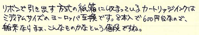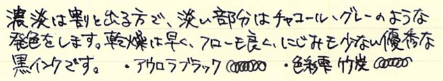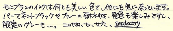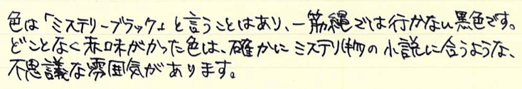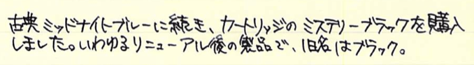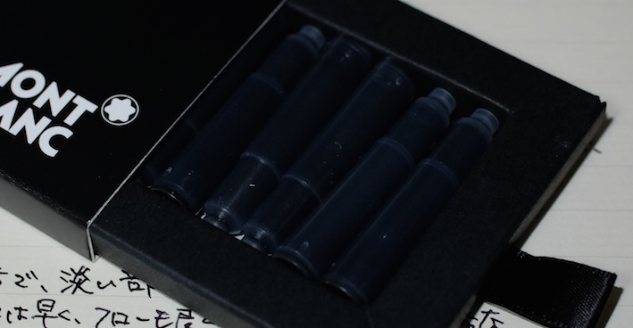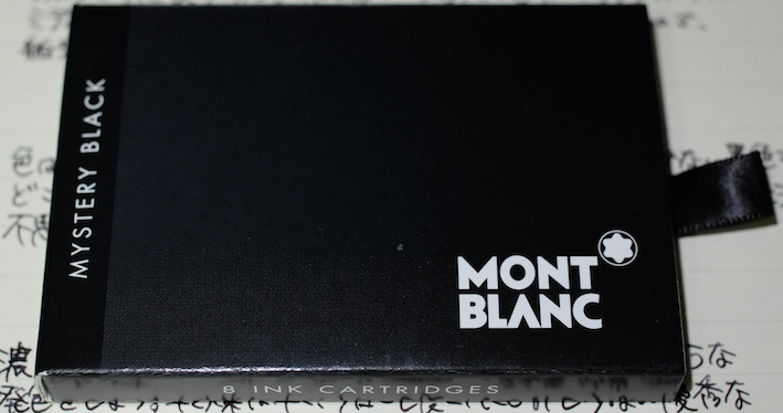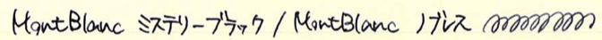 レビュー:MONTBLANC ミステリーブラック Category:インク Date:2014年07月26日 モンブランブティックが近くにある訳ではないのですが、カートリッジインクのミステリーブラックくらいなら近くの文房具店に置いてあったりします。新しいインクを買うと入れられる確率が高いノブレス。モンブランの万年筆だけあって、インクとの相性も良いようです。モンブランの黒といえば、このミステリーブラックの他にパーマネントブラックも売っていますね。ミッドナイトブルーが古典で無くなったのは、返す返す残念です。 カヴェコやエルバンなどもこの形状ですね。ロングタイプのヨーロッパ互換に比べて内容量は少ないですが、その分ショートサイズ万年筆でもしっかり使える安心感があります。 一口に黒色といっても様々な味付けがあるのがインクの面白いところでありまして、最も黒色に近いインクとなると、極黒や顔料ブラックになるのでしょうか。 スキャナを通してしまうと分かりにくいのですが、アウロラブラックや竹炭とは結構色の違いがあります。赤紫味がかった黒という感じでしょうか。モンブランブティックが近くにないために、限定のパーマネントグレーは手に入りにくい状態です。通販してくれればいいのになー。 PR