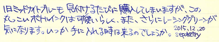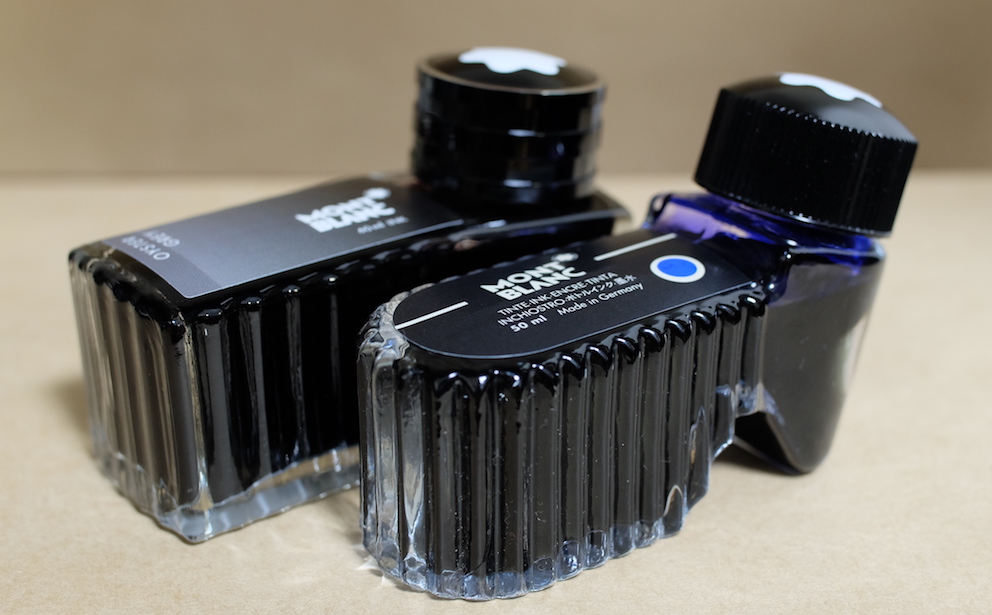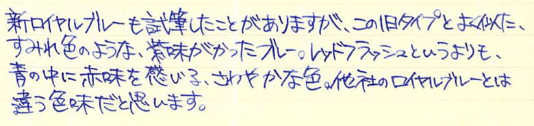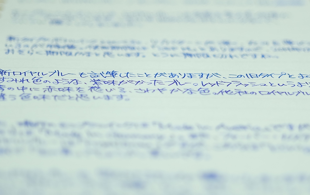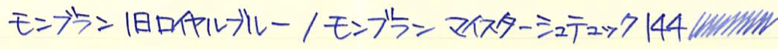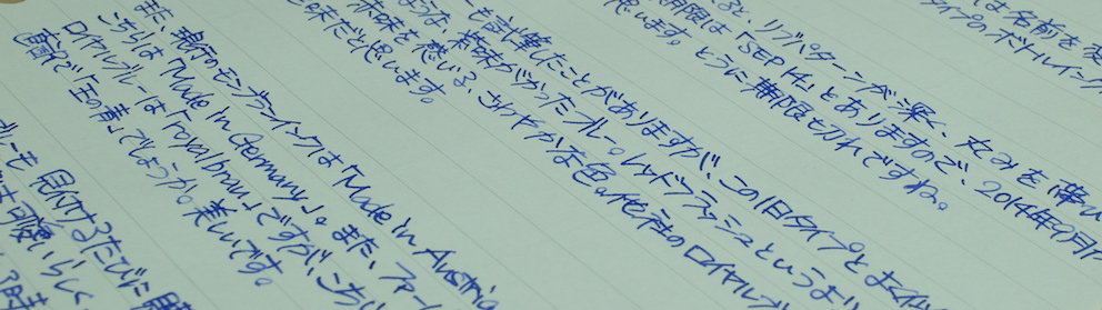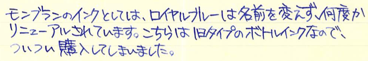 レビュー:MONTBLANC 旧ロイヤルブルー Category:インク Date:2015年12月20日 なんがかんだでモンブランが好きなのですが、あったら入手してしまうのがすでに廃番になって手に入らないインクなど。今回は旧ロイヤルブルーです。モンブランのインクは以外とリニューアルを頻繁にしており、今気に入っている色が来年はあるかわからないという悲しさはありますが、どれも非常に良い色です。 この旧型ボトルインクには名インクの誉れ高いレーシンググリーンやボルドーもラインナップしていました。特にレーシンググリーンは現在のアイリッシュグリーンとは色の方向性がかなり異なっているため、現在でも復活を望む声が多数。 現在の角形が60mlなのに比べ、旧丸型ボトルは50mlですが、価格も多少安めだったようです。深めのリブパターンと丸い靴型のボトルが可愛らしくもあり、ラグジュアリーでもあり、モンブランのイメージに合っていますね。 紫味がかったなんとも目に優しい青色で、バイオレットに近い感じだと思います。細字の144でもしっかりと濃淡を楽しむことができ、滲みや色抜けもありません。 ケーニヒスベルクやケーニヒスクローネが王の岩や王冠と訳されるのと同様に、このケーニヒスブラウは王の青と訳すべきでしょうか。濃い緑色ならcultpensオリジナルのディープダークグリーンも持っているのですが、やはりレーシンググリーンは気になりますね。方々で良い評価を伺っていますので・・・。 PR
