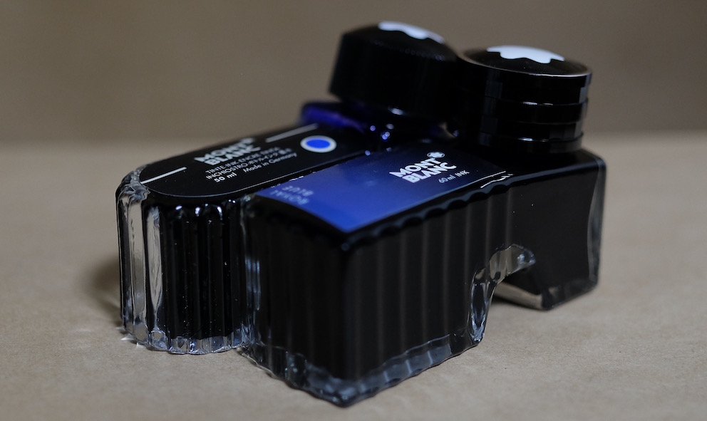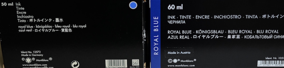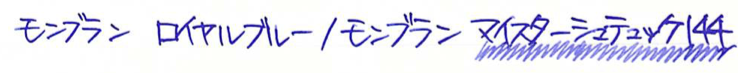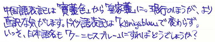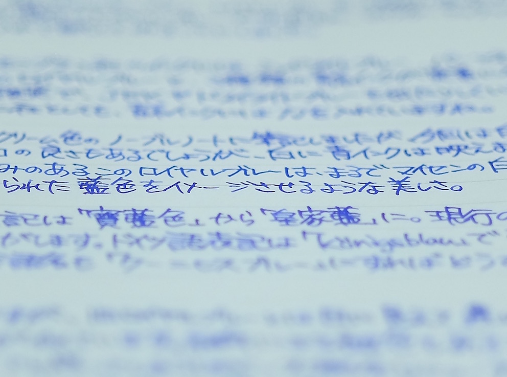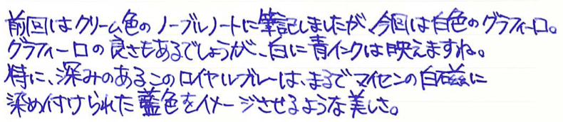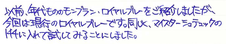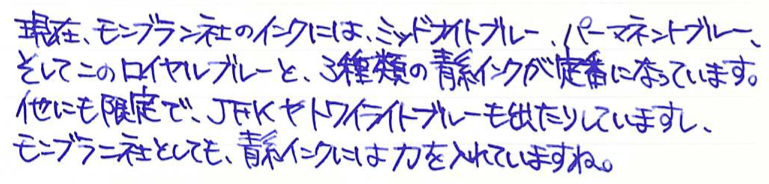 レビュー:MONTBLANC 新ロイヤルブルー Category:インク Date:2016年02月13日 以前、旧ロイヤルブルーの記事を書きましたが、今回は現行のロイヤルブルーをご紹介します。旧ミッドナイトブルーを購入したちょっと遠めの文具店で、今回は現行ロイヤルブルーを購入いたしました。旧ロイヤルブルーを使うのはもったいないですし、あまり色味に違いがないと聞いておりましたので・・・。 モンブランのインクは現行の前に、一つ前の角形ボトル時代があり、そのさらに前が丸型ボトル時代になりますので、前回ご紹介したものは二世代前のものだと思います。 トワイライトブルーは手に入れましたが、月夜系の緑みが強い、非常に美しいブルーブラックでして、レギュラーになっても良いくらいの色でした。パーマネントブルーも気になっているのですが、お高いですよね。 クリーム色のノーブルノートではレトロな美しさが、白色のグラフィーロでは青そのもののダイレクトな美しさが楽しめる感じで、個人的にはグラフィーロのほうを気に入りました。罫線なしのペーパーも手に入れたので、いろいろ楽しめるかなと。 ケーニヒスブラウは「王の青」ですので、「皇家藍」は直訳だと思いますが、「寶藍色」も詩的でいいですね。ロイヤルブルーは各社採用しているインク名ですが、そのままケーニヒスブルーをインク名にしてもいいと思います。 紫みがかった、美しい青色は旧ロイヤルブルーと変わらず。並べて書いても目に見える違いは感じられませんでした。人気のレーシンググリーンも廃番になってしまいましたし、このインクも少し心配ですね。 PR