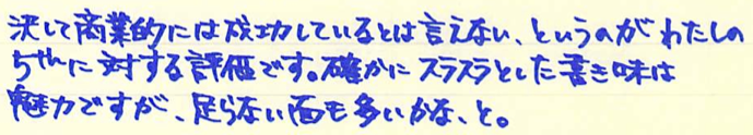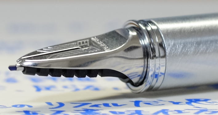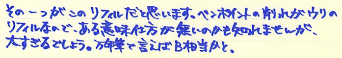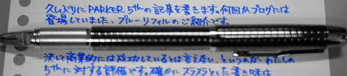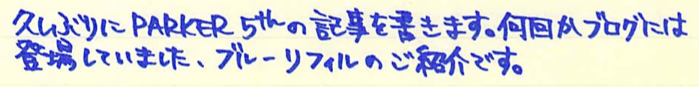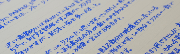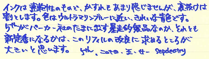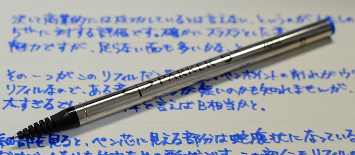 レビュー:PARKER 5th Blue F Category:インク Date:2014年05月21日 5月も下旬ですが、暑かったり肌寒かったりで風邪を引きやすい気候ですね。わたしも喉の調子が思わしくないので、皆様も御気をつけください。 パーカー社渾身の作である5thですが、百貨店などの高級筆記具コーナーに並んでいるのをよく見かけます。もう少し休めの軸を・・・と思っている方も多いでしょうね。 ブラック、ブルー、マゼンタの三種類のリフィルを持っています。他にもオリーブグリーンやピーコックがありましたね。 発売当初はあちこちで特集が組まれ、かなり注目されていた印象ですね。新聞の見開きを使って広告が打たれていた記憶もあります。 このペンポイントの削れがかなり早く、ものの一週間ほどでかなり太くなってしまいます。もちろん、一部が削れるだけですので、持ち方によっては細い字も書くことはできるのですが、鉛筆のように向きの無い製品ではないので、そういう書き方は念頭に置かれてないでしょう。 拡大してみると、ペンポイントが青色をしているのが分かりますね。スリットの空いているニブに見える部分は蛇腹部分が際限なくしなってしまうのを防ぐ抑えでしょう。スリットを開けて万年筆状にする意味はあるのか、と言われれば無いのでしょうが。 リフィルを抜くとこうなってしまいます。何が何やら、という感じですね。とりあえず、ベクターやジョッタークラスの安めの軸と、もっと細いペンポイントを持つリフィルが、わたしが5thに求めるところでしょうか。 PR