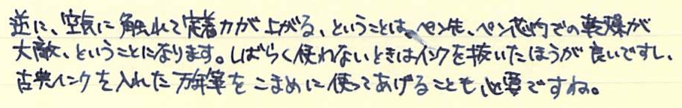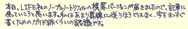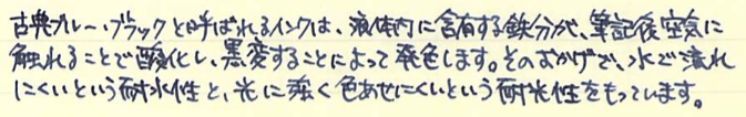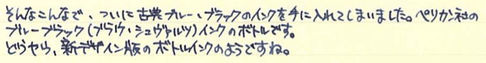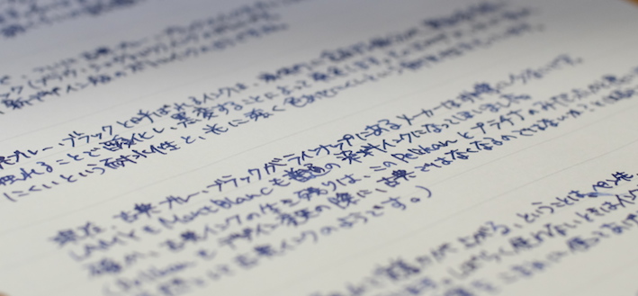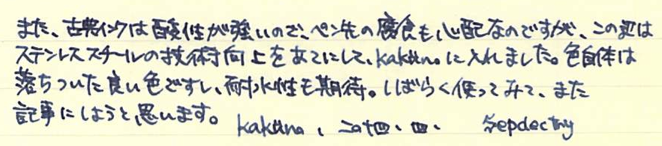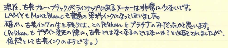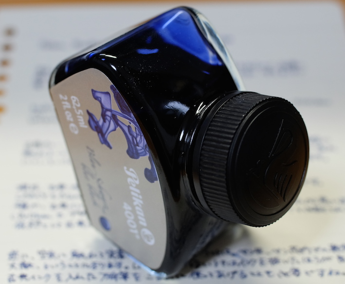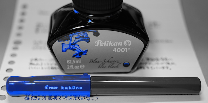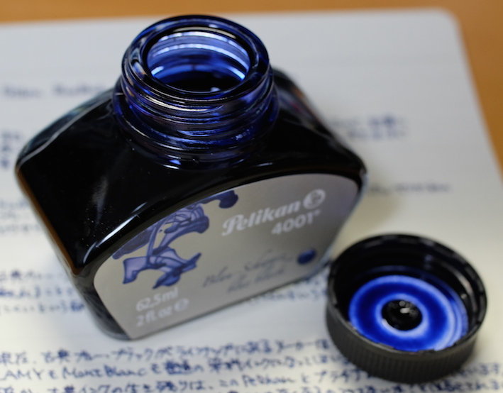 レビュー:Pelikan Blueblack Category:インク Date:2014年04月07日 この写真はパートカラー(色抽出)の昨日で青以外をモノクロにして撮ってるのですが、カクノのキャップがちょっと残念な感じですが、割と面白いです。 カメラレンズの世界も奥が深いわけでして、わたしは単焦点レンズでブログ用の画像を撮っているわけですが、物撮りをするとなるとマクロレンズが欲しいんですよねぇ。みなさんに、より印象的な画像を御見せできるように努力したいと思います。 罫線の読み方を実は、今の今まで知りませんでした、お恥ずかしい。「けいせん」なんですね。勝手に「かけせん」かと思っていました。 水にゆらぐインクのような模様が入っているのが新パッケージです。それにしても、舶来ボトルインクでしっかり62.5mlも入って1000円しないのはお買い得ですよねぇ。エーデルシュタインでも十分お買い得だと思うのですが。 古典インクにも、色そのものが落ちにくいものと、水にぬれても筆跡が読めるものの二つがあるようですが、こちらは後者ですね。色は落ちていますが、筆跡はしっかり残っています。ちなみに染料インク代表はタンザナイト。 耐水性があるということには、一定の需要があると思うのですが、メーカーは古典ブルーブラックの製造から撤退しているのが現状です。顔料インクに手を出すという方法もあるにはあるのですが、鉄分のおりなす絶妙の発色そのものに魅せられる人も多いので、難しいところです。 古典ブルーブラックから通常の染料インクへの乗り換えが進んでいる原因がこれで、逆に古典インクが主流だった当初の扱いの難しさが、そのまま万年筆の気難しいイメージにつながってしまっている、とも言えると思います。 個人的には、そこまでナーバスになる必要もないかなと思いますけどね。過去と比べて、現在の万年筆はキャップ内の気密性も格段にあがっていますし。ちなみに、ペリカンのボトルインクは立てることで残り少なくなっても吸引しやすくなっています。スーベレーンなどの吸引式が主流のメーカーらしい気配りですね。 出来れば、ペリカンの軸に入れたいところですが、わたしが唯一所有しているペリカンのシグナムには、えらく気に入っているアンバーを入れているので現状、入れる軸が無い状態なのです。勘合式のシグナムに入れるのは、ちょっと怖いですしね。 PR
