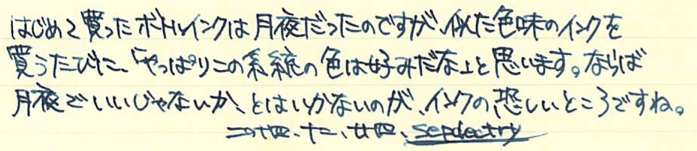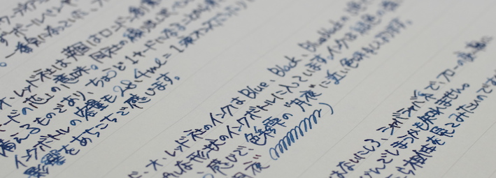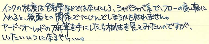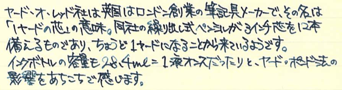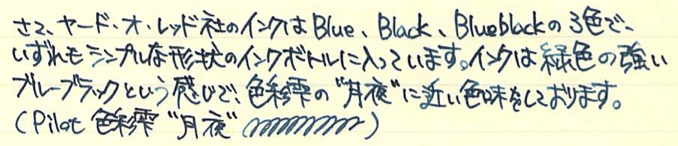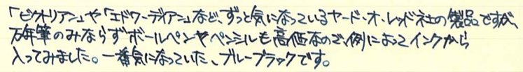 レビュー:YARD・O・LED BLUEBLACK Category:インク Date:2014年12月24日 世の中はクリスマスだなんだとうるさいのですが、わたしは敬虔な仏教徒なので関係ありません。本日も楽しくインクのレビュー記事を書いていこうと思います。さっそく、ヤード・オ・レッドのつづりを間違えてしまってお恥ずかしいのですが、以前からちょくちょく「月夜と似ている」「ヤード・オ・レッド系のブルーブラック」と書いてきた、まさにそのヤード・オ・レッドのブルーブラックのご紹介です。 ビクトリアン、エドワーディアンはそのまま、ヴィクトリア女王、エドワード7世の統治時代を指します。特徴としては華美で重厚なビクトリアン、洒脱ながら軽やかなエドワーディアン、という感じでしょうか。ちなみにリージェントなんてシリーズもあります。これはダイアミンのインクの記事でも書きましたが、ジョージ4世の摂政時代ですね。1ヤードはおよそ0.91メートルですから、ヤード・オ・レッドの繰り出し式ペンシルはかなりの長さの芯を保持することができます。理論上は・・・。実際は芯を入れるスペースが小さく、芯が入ったまま出て来なくなったりするらしいですが。液オンスは聞き慣れない単位ですが、ヤード・ポンド法の容積の単位であり、カクテルグラスの用量が3液オンスだったりするらしいです。 写真を見ても、スキャン画像を見ても、色彩雫の月夜との違いはわずかです。強いて言えば、レッドフラッシュする月夜に、しないYOLのブルーブラックと言ったところ。 月夜は好きだけど、シャバシャバすぎてにじみが気になる!という方は、このYOLのブルーブラックを試してみても良いかも知れません。お値段は月夜の方がよっぽどお得なのですが・・・。月夜、青墨、そしてこのブルーブラックと、いわゆる月夜系統のブルーブラックも増えてきました。深海系統のブルーブラックはそもそも深海を持っていないのでいかんとも言いがたいですね。手に入れちゃおうかな・・・。 PR