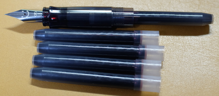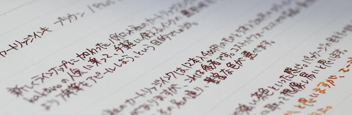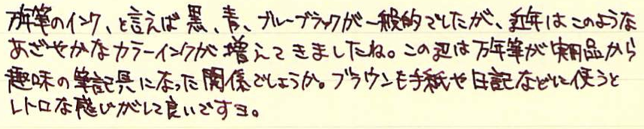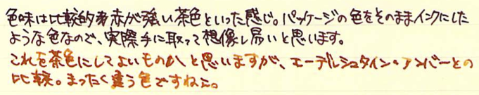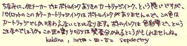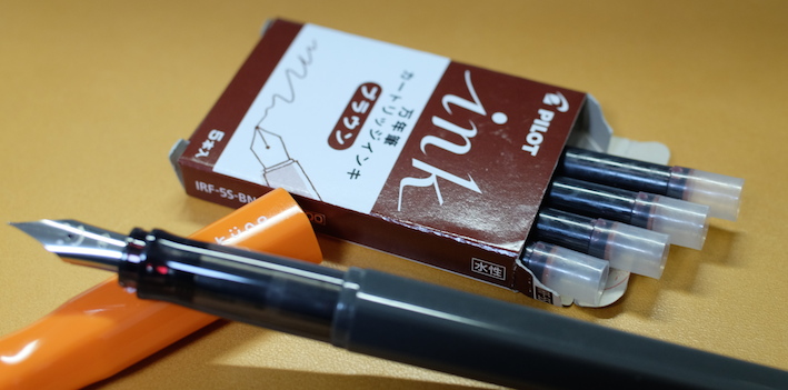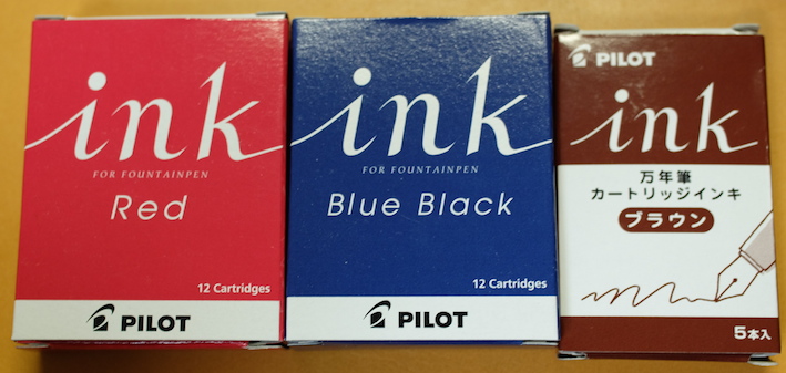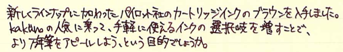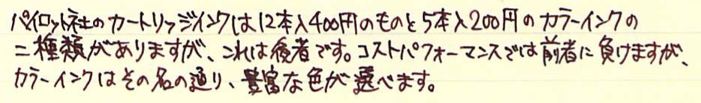 Pilot カートリッジインキ ブラウン Category:インク Date:2014年04月22日 パイロットと言えば色彩雫ですが、カートリッジインキにも割合い力を入れている印象です。本日はそんなパイロットから、カートリッジインキ ブラウンのご紹介です。 巷では、petit1用のカートリッジインクをkakunoでも使えるような話もありますので、カートリッジインクのバリエーションは相当豊富になっていますね。 パイロットのカートリッジインキ(カラーカートリッジ)には先日、ブラウンとブルーブラックの二色の新色が追加されました。ブルーブラックはもともとあるとして、ブラウンは待望だった人もいるのでは。 上の画像のレッドとブルーブラックが12本400円のもの。ブラウンが5本200円です。舶来のカートリッジと比べるとコストパフォーマンスの良さが際立ちますね。 アンバーがかなり特殊な色なのは間違いないのですが、ブラウン系のインクもブルーブラックと同じくらい奥が深いですね。例えるなら、アンバーはキャラメル、パイロットブラウンはチョコレートでしょうか。どちらもおいしそうな色です(笑 趣味のカラーインクが充実してきたのは素晴らしいことなのですが、古典ブルーブラックのような実用インクもしっかり残して欲しいですね。 メーカー側からするとカートリッジインクの方が製造する手間が多いでしょうし、ボトルインクはあっても、カートリッジがない、というのが一般的ですよね。色彩雫のカートリッジインクを出すのが、もしかしたら一番良いのかもしれないですが、あの豊富な色だとかなり面倒でしょうね。既存のカラーカートリッジを充実させるのはかなり良い手かなと思います。 PR