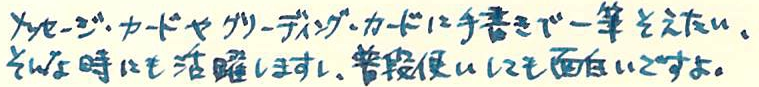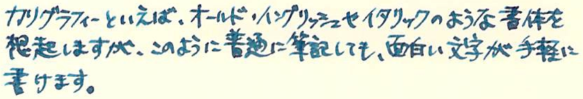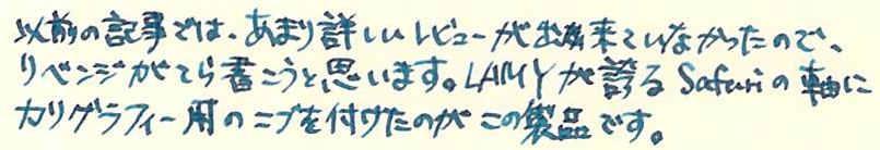 その後 LAMY joy Category:筆記具 Date:2014年03月29日 その後シリーズ第三弾なのですが、もともとがラミー・ジョイの記事があっさりしすぎていたので、焼き直しのような感じです。 思えば、一番最初にレビューした筆記具がこのジョイでした。ブログの題字を書くために買ったような感じでしたが、思った以上にカリグラフィー・ペンは楽しいですね。 そういえば、サファリの2014ねん限定カラーはピンクでしたね。ちょっと派手すぎるかなぁ。今回はスルーです。 これが15や19になるとちょっと日本語の筆記には太すぎます。カリグラフィーとしては太い方が特徴が出ますけどね。 なんちゃってイタリック。カリグラフィーを正式に勉強している訳ではないのであまり上手じゃないですね。オールドイングリッシュとか買いてみたいのですが。 これでアラベスクなんか書いても様になりそうですね。 黒ニブや金ペンなんかも売っていたりして、その気になれば金ペンバージョンのサファリを作ったりできそうです。ファーバーカステルも海外では交換用ニブを扱っていたりするのですが日本ではあまりそういう商品展開をしないんですね。 PR