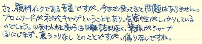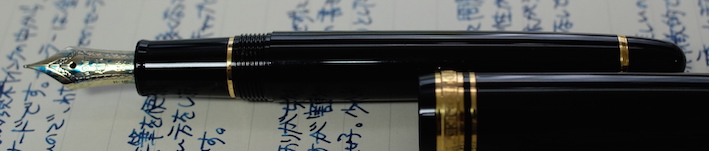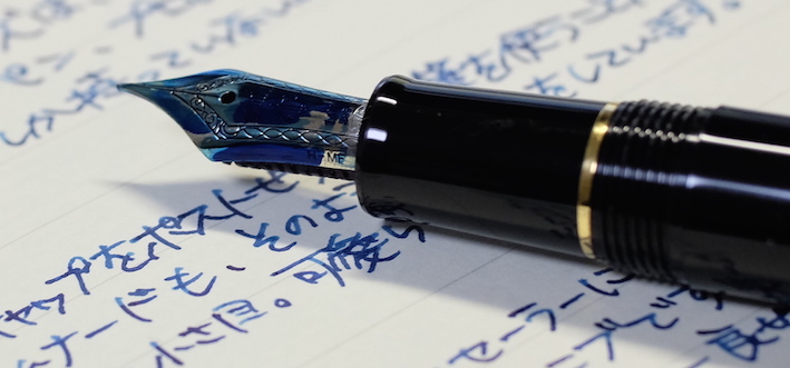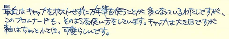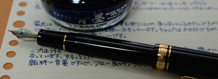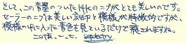その後:セーラー プロムナード・青墨 Category:筆記具 Date:2015年01月07日 もっとマクロが効くカメラが欲しいのですが、マクロレンズを買うべきか、コンデジのx30を買うべきかちょっと悩んでいます。x30を買っちゃうとそればっかり持ち歩きそうで・・・。長刀研ぎはかなり特殊な万年筆なのでともかくとして、セーラーの金ペンとなると定番のプロフィットスタンダードが有名ですが、わたしが持っているのはこちらのプロムナード。プロスタよりもちょっとお安い万年筆です。 万年筆を使っていくうちに、徐々に持つ位置が軸の後ろに近づいていっています。それに伴って、万年筆によってはキャップをポストせずに使うようになりました。もともと、ファーバーカステルなどの一部の軸はポストせずに使っていましたので違和感はありません。 まさにプロフィットスタンダードが14kニブに24金めっきなのですが、個人的には控えめな14kの輝きで十分だと思うんですけどね。セーラーの金ペンの書き味ですが。以前「よく熟した洋梨の歯触り」と表現したことがあります。少しシャリ感があり、大変好み。 セーラーの青墨もプラチナのカーボンブラックも、大変優秀で使い易いインクなので、顔料インクに対する先入観がいい意味で裏切られました。両方とも純正の万年筆で使っていてインクの固着などの問題は今のところなし。発色の良さや耐水性、にじみのなさなど、オススメポイントはいっぱいありますね。 さすがに顔料インクがベットリ付いたままキャップを締めるのは怖すぎるので、しばし眺めてから拭き取るようにしています。模様に青色が入ってとても綺麗ですよ。 PR