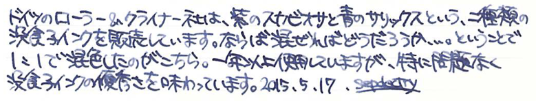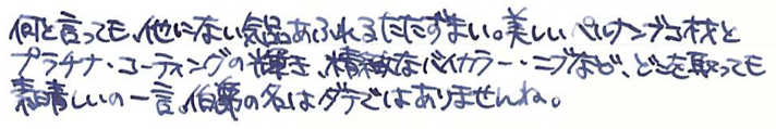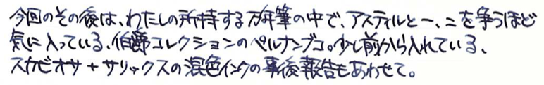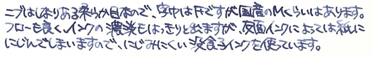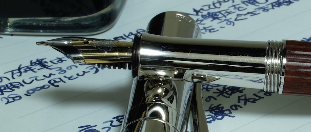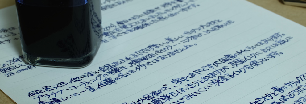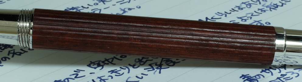 その後:伯爵コレクション ペルナンブコ Category:筆記具 Date:2015年05月17日 ペルナンブコはわたしがおそらく初めて万年筆として意識した万年筆です。確か高校生のときに鉛筆を探していて、なんだこの凄そうなのは!と思った記憶があります。そこから何年かして、わたしの手元にやってきたペルナンブコ。そこからは見て感動、触って感動、使って感動といった感じで、毎日ニコニコしながら使っています。 当時から今に至るまで、28000円というのはまさに破格だと思います。並品ということで、木材部分に小さなクラックがあるという話でしたが、ほとんど目立ちません。これを「クラックがある」と商品説明にちゃんと書いているのは素晴らしいですね。 個人的にはシルバーコーティングの方が良いと思いますが、廃盤なので入手困難です。このペルナンブコの深い色味といい、たまりませんね。ペルナンブコはボールペンとペンシルも持っていますが、ローラーボールはまだ手に入れておりません。 このニブはペリカンのOEMであるという話ですか、スーベレーンで言えば400や600ではなく、300や1000のようなタッチのニブだと思います。18kロジウムコーティングの美しさをバイカラーでしっかりと楽しめます。 ブルーブラックがほとんどを占める中、紫色の没食子インクはとっても珍しく、そんな二色を混色してみたのがこちら。褪せた青色の中にかすかに紫が混ざるような色で、勝手に「夜の帳」なんて名付けたりしています。ペルナンブコと一緒に、一日の終わりにゆっくりと日記をしたためる・・・そういった用途に向いた色だと思います。 PR