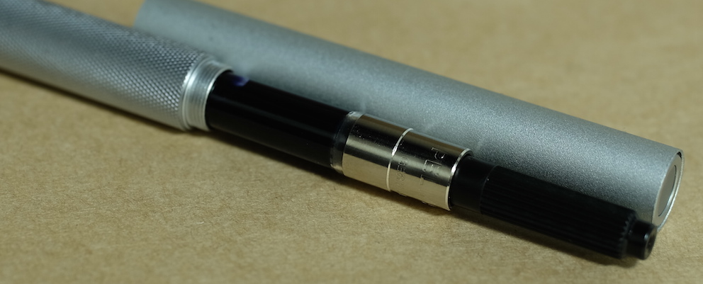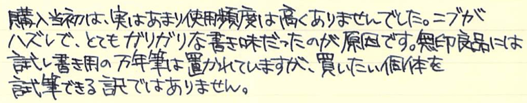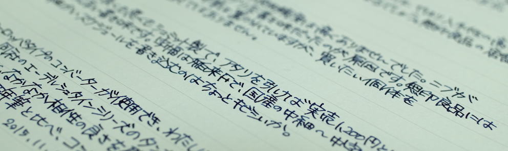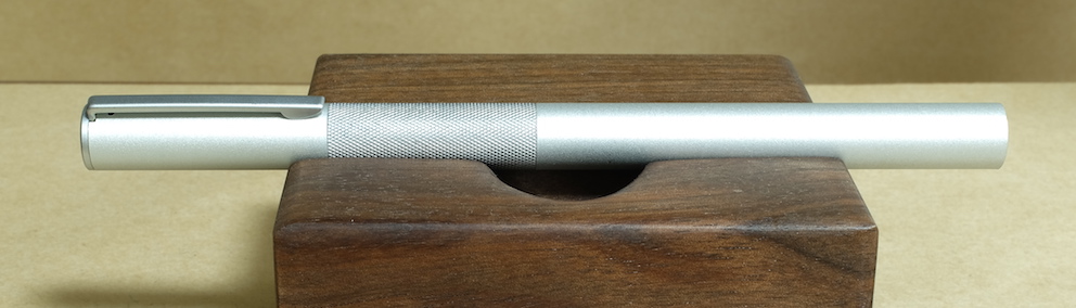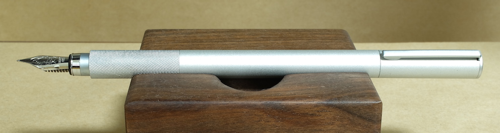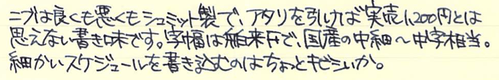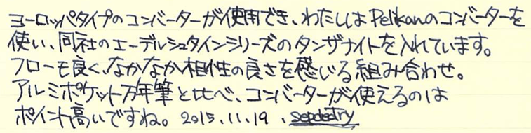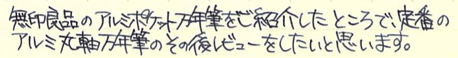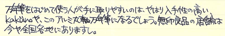 その後:無印良品 アルミ万年筆 Category:筆記具 Date:2015年11月19日 前記事はこちらになります。レビュー:無印良品 アルミ万年筆無印良品だけではなく、万年筆の自体の定番にもなっている気がするアルミ万年筆。スタンダードですが個性の強い万年筆だと思います。 国際的な評価の高いシュミット社のニブですが、供給数の多さもあって当たり外れは有ります。ある程度の高級品だと検品や調整をしているのでしょうが、この価格帯だとどうしても外れがあるのは事実。 どちらも鉄ペンになりますが、近所の書店や無印良品の店舗で気軽に手に取れる価格ですし、最初の一本に選ばれやすいのかと思います。キャップは嵌合式ですが、しっかりとインナーキャップがあります。 随所で言われていることですが、字幅はFにしては太めと言えるでしょう。個人的には好きな太さなのですが、細かい文字を書くのは少し苦手かと思います。 アルミポケット万年筆はカートリッジについてはかなりシビアでしたが、こちらのアルミ丸軸万年筆はヨーロッパタイプのコンバーターが使用できるので、インクの幅が広がります。アルミ丸軸シリーズは以前はボールペンなどがラインナップしていたようですが現在は廃盤になり、この万年筆のみなのが少し寂しいです。 PR