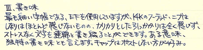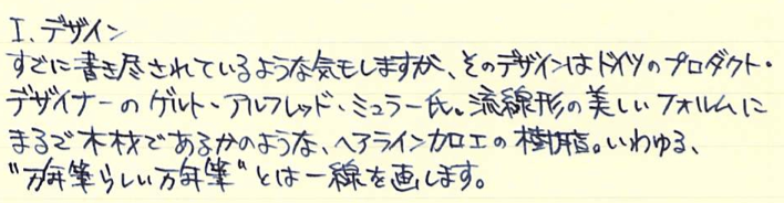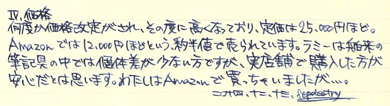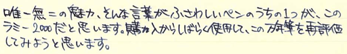 その後:LAMY 2000 万年筆 Category:筆記具 Date:2014年12月13日 ネタ切れのときの最後の手段、その後シリーズ。今回はラミー2000万年筆です。最近インクをラミー純正のブルーブラックに変えてから、使用頻度が上がっています。モンブラン・マイスターシュテュックやペリカンのM400がオーバースローのストレートならば、このラミー2000はサイドスローから外角に落ちるシンカーと言ったような万年筆だと思います。分かり難いですが、替えが利かない魅力、とでも言いましょうか。 ラミー社は2代目のマンフレッド・ラミーの時代から、外部のデザイナーを招聘して筆記具を作っていたそうです。本社のあるハイデルベルクは中世はライン宮中伯領、近世はプファルツ選帝侯領の首都として重要な位置づけをされた、いわゆる古都です。 ピストン吸引式はおそらく最も一般的な万年筆のインク吸引機構であり、軸のしっぽを回転させながらインクを吸引するのは一つの醍醐味だとも言えます。このつまみの処理の仕方にもこだわりが見受けられます。この辺は後のモンブラン220も参考にしたのではないでしょうか。 ニブは軽いアールが付いたフーテッドニブで、構造上あまりしなりは発生しないようになっていると思います。が、滑らかさは素晴らしく、「つららを濡らしてツルツルのガラスの表面を走らせたような」書き味です。これは粘度が高めのラミーの純正インクを使用していることにも起因しているのかも知れません。美しい流線型の軸は、キャップをポストせずに手で包み込むようにして持つのが良いと思います。 以前はもっと安く購入出来たという話をよく耳にしますので、そのときに買っておけば・・・と後悔する方もいらっしゃるでしょうが、インク吸引口が金属の一体成形になっていたり、字幅が全体的に細めになったりと、細かなバージョンアップも施されていますので、決して出遅れた!と思う必要はないです。価格はインターネット購入だとかなり御安く、吸引式で14kニブの万年筆としては抜群のコストパフォーマンス。唯一の問題点は、材質上、ネジ切りの部分の破損が非常に多いこと。万年筆はともかく、マルチペンなども気をつけなければいけません。 PR