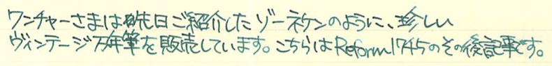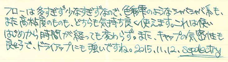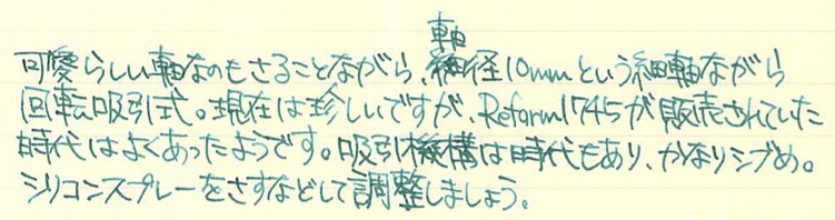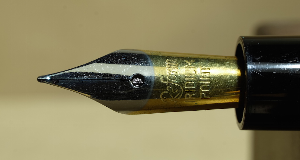 その後:Reform 1745 Category:筆記具 Date:2015年11月12日 前記事はこちらになります。レビュー:Reform 1745なぜか、定期的に供給されるワンチャーさまのリフォーム1745。廃番品ですが、いまだにデッドストックの新品を手に入れることができます。 その後記事を書いていて思うのですが、エクステンションチューブを購入してから、かなり寄った写真を撮ることができるようになって、より詳細なご紹介ができるようになっていますので、今後はその後記事にも力を入れようかと思っています。 特にニブの画像は寄れることがとても強みになりますね。ご覧の通り、デッドストックの古い万年筆ですが、美しいバイカラーのニブになっています。イリジウムポイントという表記は現在のシュミット社のニブにも見られますね。 めっきの質にもよるのでしょうが、デッドストックの宿命か、すでに購入時点で剥がれかけている部分もありました。わたしはレトロチープな雰囲気も含めてこの万年筆を気に入っているので、あまりめっきのはがれなどは気にならないのです。 このちょうどいいフローとタッチの柔らかいニブもあって、非常に書いていて楽しい、疲れない万年筆になっています。価格も2600円とお安いですし、多少の欠点に目を瞑れるならおすすめの一本だと思います。 PR
