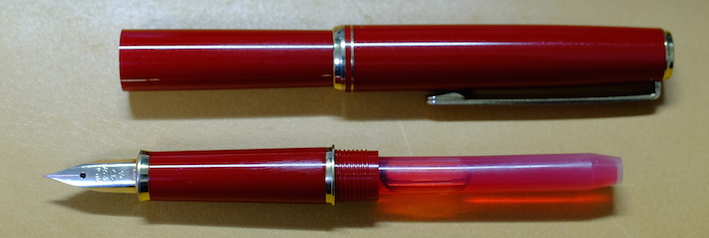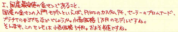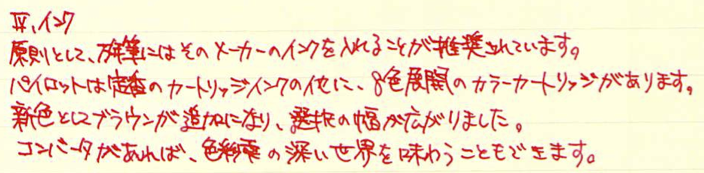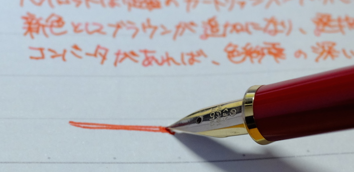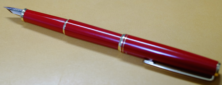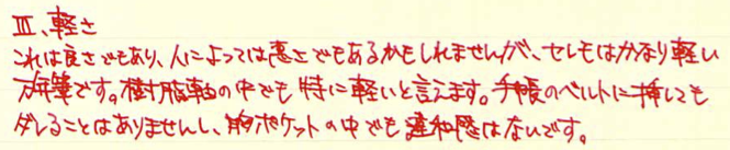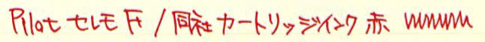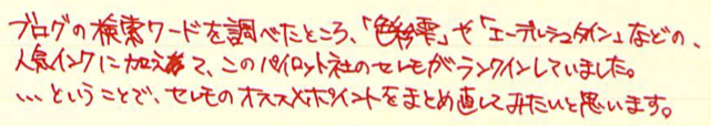 コラム:パイロット・セレモ万年筆について Category:筆記具 Date:2014年04月17日 一見何の変哲も無い樹脂軸万年筆ですが・・・。 以前は伯爵コレクションのガーネットレッドを入れていましたが、結局パイロットのカートリッジインク赤色に落ち着きました。清々しい赤色です。 検索ワード第一位が「インク」と「パイロット」。続いてこの「セレモ」なのです。やはり、カクノなどの入門版万年筆の人気と、そこからステップアップしたい方にとってはセレモは有力な選択肢の一つなのかな、と思います。カクノをおすすめする記事は世の中にたくさんありますので、ここはあえてセレモを・・・。 カスタム74は実売最安値がおよそ7000円、セレモは4000円台です。前者には豊富なニブのバリエーションがありますが、セレモはFとMのみです。5000円を切る価格は、カクノからのステップアップには最適かなと思います。 わたしは細字をおすすめします。こういった弾力のあるペン先には細字が合うと思います。メモ帳などに細かい字をすらすらと書くことができます。 もちろん、重い軸が好きか軽い軸が好きかは個人的な好みです。しかし、セレモのような実用品と言える万年筆は、どこに入れても大丈夫な手軽さが必要かなと思います。セレモは超ロングセラー商品ですので、まさに万年筆が実用品だった時の良さが残っていると思います。 パイロットのカートリッジインクのコストパフォーマンスは最強です。12本入り400円。おそろしいです。カラーインクはもう少しお高いですが。万年筆らしさを味わえるブルーブラックがおすすめです。 コンバータを入手すれば、好きなインクを使えます。おすすめは色彩雫ですね。良い色揃いなので迷ってしまいますよ。ぜひ、インクの世界を楽しんでください。カクノで使っていたカートリッジもコンバータも、そのままセレモで使えますし、金ペンの良さを味わってみるのにはおすすめの一本ですよ。 PR
