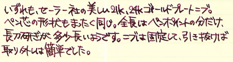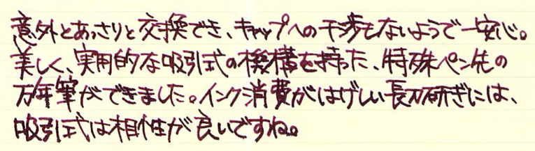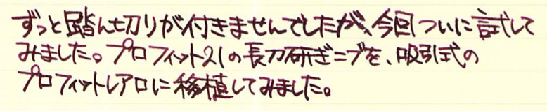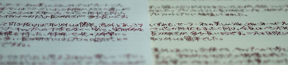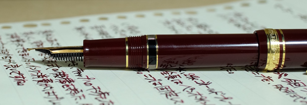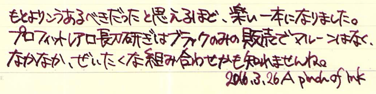 コラム:レアロを長刀研ぎに Category:筆記具 Date:2016年03月26日 以前から楽しく使っていた、セーラー万年筆の吸引式万年筆、プロフィットレアロ。 それは、「レアロのニブとプロフィット21長刀研ぎのニブは付け替えられるのでは?」という疑問。レアロは分解ができないと聞いていましたが、ニブくらいならと思い、試してみることに。 プロフィット21は両用式の万年筆で、それそのものには全く不満はないのですけれど、やっぱり吸引式の楽しさと実用性を長刀研ぎでも味わいたいなと思い…。 わたしはニブを取り外す時にゴム手袋をよく使っています。摩擦の力を借りてスポッと。デリケートな部品なので、力の加え方に気をつけましょう。 スイートスポットが大きく、独特の書き味と潤沢なインクフローが特徴のセーラー長刀研ぎ。インク消費も激しいのですが、吸引式になることでインク切れすら楽しい万年筆に。 プロフィットレアロ長刀研ぎはブラックのみの販売ということで、このマルーンはわたしのように、自分で付け替えをしないと手に入らない組み合わせということに。美しいオリジナルインクと一緒に、これからも楽しんでいこうと思います。 PR