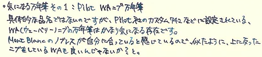 コラム:気になる筆記具その1 Category:筆記具 Date:2014年02月25日 筆記具レビューとその他の割合をどのくらいにしようか現在迷い中です。 たまにはカメラとか自転車の記事も書きたいのですが、もうちょっと我慢しようかな。 こんばんわ、sepdectryです。 上のエラボーもそうですが、とりあえず欲しいものリストみたいなのがわたしにはありまして、 あとはお財布とタイミングを合わせて手に入れよう、というのが毎回のパターンなのです。 といっても、突然の出会いやら勢いやらで買ってしまうこともありますので 例外も多々あるのですが・・・。 本日はそんな、欲しいものリストの中から、気になるパイロットの万年筆の話を。 ウェーバリーはどんな筆記角、どんな向きでも書き味がいい、というのが売りなのですが、 以前、ノブレスやジェムラインの記事の中でも触れたかもしれませんが、 どうやら寝かせて筆記する傾向のあるわたしには、ウェーバリーのように 上に反ったニブが合っていると思うのです。 もちろん、ノブレスもジェムラインも、ウェーバリーほどは反っていないので 実際、書いてみてどんな感想が浮かぶかは分からないのですが。 カスタムへリテイジ92には特殊ニブは無かったですよね? となると選択肢は結構狭いです。742が狙い目かなぁー。 あの、ジャスタス95でイラストを描く動画は「例の動画」並みに衝撃でした。 書き味を変えられるというギミックも魅力ですし、コントローラーがまた いいですよねぇ。ああいう機能がデザインの一つになってるようなものは好みです。 (画像はパイロット社公式から御借りしました。) 一見シンプルな黒ですが、ネットブラックとストライプブラックという 二種類のパターンが用意されているのがさりげなくていいですね。 こういうギミッキーな製品だからこそ、遠目では極力シンプルに、 近づいてみると、「おおっ」と思わせる趣向。 復刻モノや新商品がかなりのペースで出ているところを見ると、 やはり万年筆はリバイバルブーム傾向にあるようですね。 カクノも新色が出ましたし、セーラーはマイファーストを出すなどして、 一過性のブームメントで終わらせないように、新規層の開拓に乗り出してますね。 もうそろそろ三月。春ですね。個人的には雪も早くなくなって欲しいです。 自転車も乗れますしね。 PR