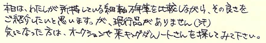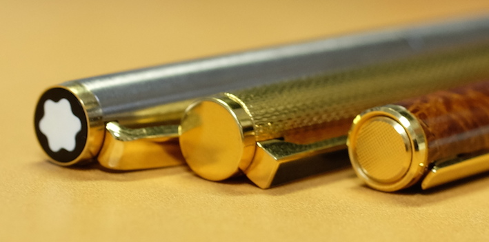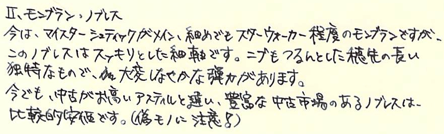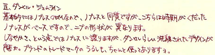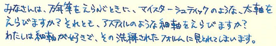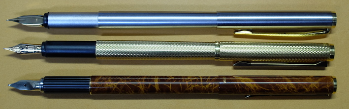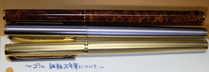 コラム:細軸万年筆について Category:筆記具 Date:2014年03月31日 最近、というかここしばらくずっと、細軸ブームです。字幅の好みの次に、万年筆で好みが分かれるのが軸の太さではないでしょうか。 マイスターシュティックも確かに一本ほしいです。手に入れたら手に入れたで、大好きになると思います(笑それは、機会が来るまで待つということで。 某キングダムノートさんには本当にお世話になっています。東京に住んでるときに行っておけば良かったなとしみじみ。 タルガスリムはかなり異端だとして、アスティル、ノブレス、シグナムあたりはニブの形状も似ていますね。シグナムはそのうち手に入れようかなと思っています。このアスティルはイタリアンデザインということで贔屓目に見ているのを抜きにしても、本当に美しいですね。原点にして至高、というべきでしょうか。 アスティルはまるく大きいペンポイントが付いているのですが、このノブレスは三角形のペンポイントです。また、ニブの穂先が長いこともあって、弾力性があります。軸のバリエーションがかなり豊富で、このステンレスシルバーのようなシンプルなものから、ゴールドのリブパターンのものまで。気に入る一本があると思います。 ノブレスにオブリージュが出たころの、後期デザインのOEMだと思います。このころになるとニブもウイング型なのですが、独特のしなやかさは健在です。ジェムラインもこのゴールドバーレイの他に、シルバーのものがあったりしてバリエーションがあるのですが、やはりダンヒルの製品らしく、どちらかというとラグジュアリー系のデザインで、好みが分かれるところ。 三本並べると、おのおのの似ている点、違う点が分かりますね。ちなみに、アスティルのクリップは繊細すぎて使えません(笑もともとの隙間が小さすぎるのと、クリップが薄すぎるので・・・。デザインとしては美しいのですが、無理して使って曲げちゃうとショックが大きそうです。 PR