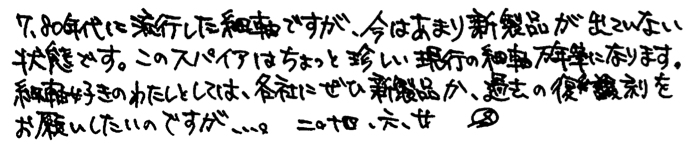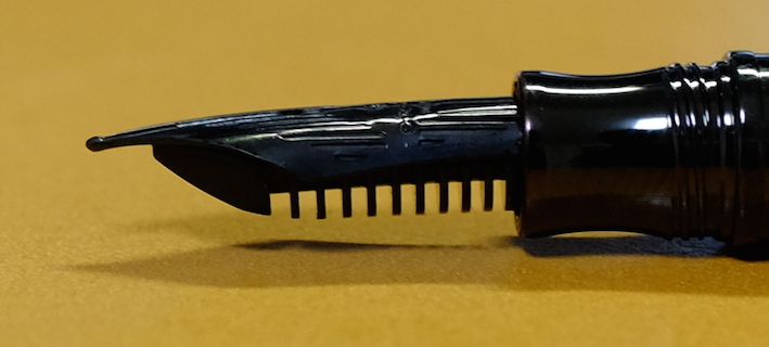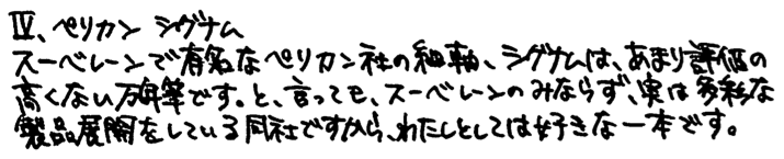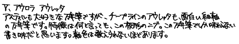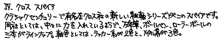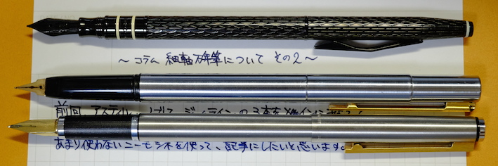 コラム:細軸万年筆について その2 Category:筆記具 Date:2014年06月22日 結構検索で来られる方が多い細軸万年筆の記事。今でも細軸に興味がある人は一定数いるんですね。 今回の三本はスパイア、アウレッタ、シグナムにしました。特にこの中だとスパイアが気に入っているかな・・・? ニブは18kなのですが、信じられないくらいのガッチガチのニブです。フローは良好なので、どちらかというと書き味は良い鉄ペンに近いかも・・・。PVDコートが施された黒いニブは美しいのですが、反面調整には大変苦労するだろうなぁ。まぁ、それを差し置いてもこの他にない個性的なデザインは素晴らしいですね。 首軸からニブにかけては、爪ニブやフーテッドニブを思わせるようなフォルムなのですが、書き味はまったく違います。縦に柔らかく、横に硬く。斜めにひねって筆記するわたしですが、このアウレッタを使っていて一番楽しいと感じるのはやはりペンポイントを垂直に紙にあてて筆記しているときでしょうか。面白いですよ。 ペリカンの記事でもシグナムをとりあげましたが、わたしとしては本当に評価してほしい一本なのです。軸の種類も意外と豊富で、シルバープレートやらゴールドプレートやらいろんな種類があります。他にもボールペンやペンシルもあったようなのですがいかんせん人気の無かった製品なので、あまり市場には回ってきませんね。 話は変わるのですが、今までマニュアルフォーカスで撮影していたのですが、オートフォーカスも結構使えますね・・・。三脚でぶれを押さえればもっと良い写真が撮れる気がします。 PR
