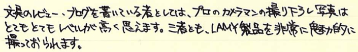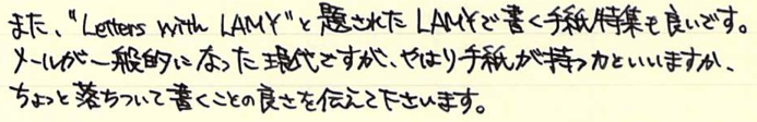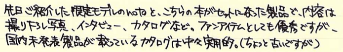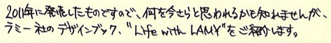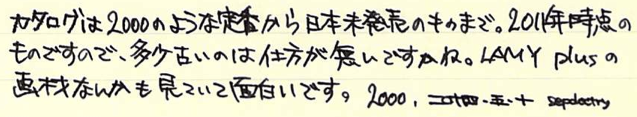 コラム:Life with LAMYについて Category:筆記具 Date:2014年05月10日 ラミーのオフィシャルブックといえば、「ラミーのすべて」も気になる存在でして・・・。製品紹介なんかはとても詳しいらしいですので、是非手に入れたいです。 で、今回はもう片方のオフィシャルブック、ライフ・ウィズ・ラミーをご紹介。 ちょっとやんちゃな開け方をしちゃいましたが、ラミーらしいパッケージングですね。先日の限定モデルnotoもこちらの中身になります。 本の中身を撮ってレビューするのは、ちょっと違うかなと思うのです。著作権的な意味もありますが、中身は御買いになられてからのお楽しみということで。写真は日本で活躍する3人のカメラマン撮り下しということで、非常に濃い内容。特にダイアログ2の写真と白いジョイに白い蛇が絡む写真に目を奪われました。 「普通に使えること」って、一番重要だと思うんですよね。コンセプトデザインならともかく、プロダクトデザインの世界では、実際に製品を使う人のことを考えざるを得ないので、より難しいのかなと。 全然写真とは関係ないのですが、こういう製品でもボールペンをつけているということでしっかりと説明書を付属させてくるあたりが、しっかりしてるなと・・・。この辺は代理店のDKSHジャパンの意向かもしれないですがね。 カタログはやはり、2000から始まっています。一部は原寸大写真になっているようで、2000万年筆はサイズピッタリでした。ラミーファンなら是非購入をおすすめします。 PR