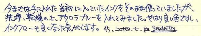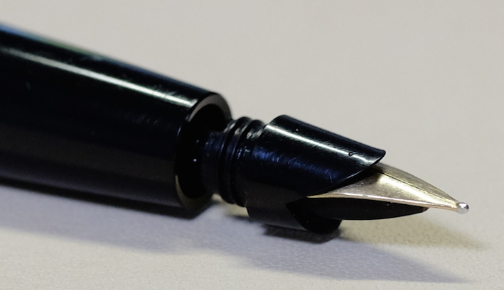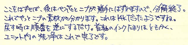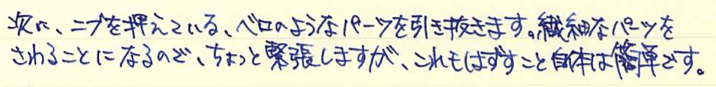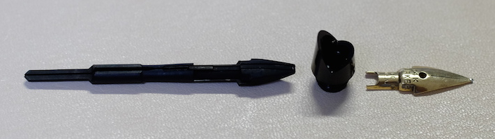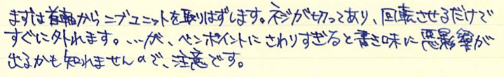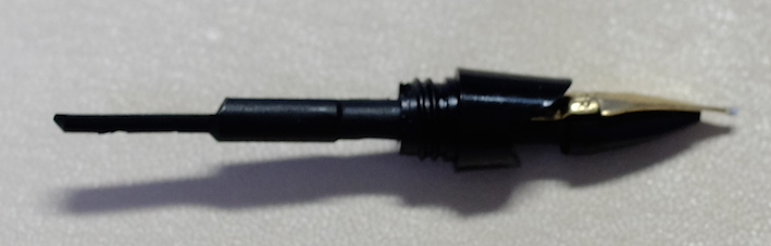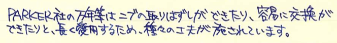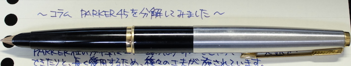 コラム:PARKER45を分解してみました Category:筆記具 Date:2014年07月04日 分解、と言ってもメーカーで想定されているニブユニットの分解のみです。軸内部の分解はちょっと怖いので・・・。ジャンクの万年筆を手に入れたらやってみようと思っています。 PARKER75もニブが容易に取り外し出来ますので、ジャンク同士を組み合わせて筆記出来る状態に持っていけたりします。オークションの中古もパーツを寄せ集めたものがあったりしますので、注意が必要です。 特にパーカー社の万年筆のように数が出ているものは、いろんなサイトで分解の手順が公開されていますので、参考にすることをおすすめします。 全体的な作りは若干おおざっぱなところのあるアメリカ製品ですが、こと、合理化の面においては本当に素晴らしい発想をしています。この45万年筆もその傾向が見て取れますね。 取り外したニブユニットがこちら。 これは別段ネジが切ってあるわけではないので、単純に引き抜くだけです。ペンポイント付近を触ることになるので、注意しましょう。 なんとも簡単ですね。ニブは14kで、なんとハート穴までスリットがつながっていないことが分かります。ハート穴の意味があるのかは謎です。 組み直して終了。45万年筆はニブの露出している部分に刻印がありませんので、材質の判断が出来ません。分解自体は容易なのですが、オークションだと出品者さんがそこまでやってないことが多いので、写真のみで判断することになります。ニブの色で・・・となると、ちょっと難しいですよね。 PR