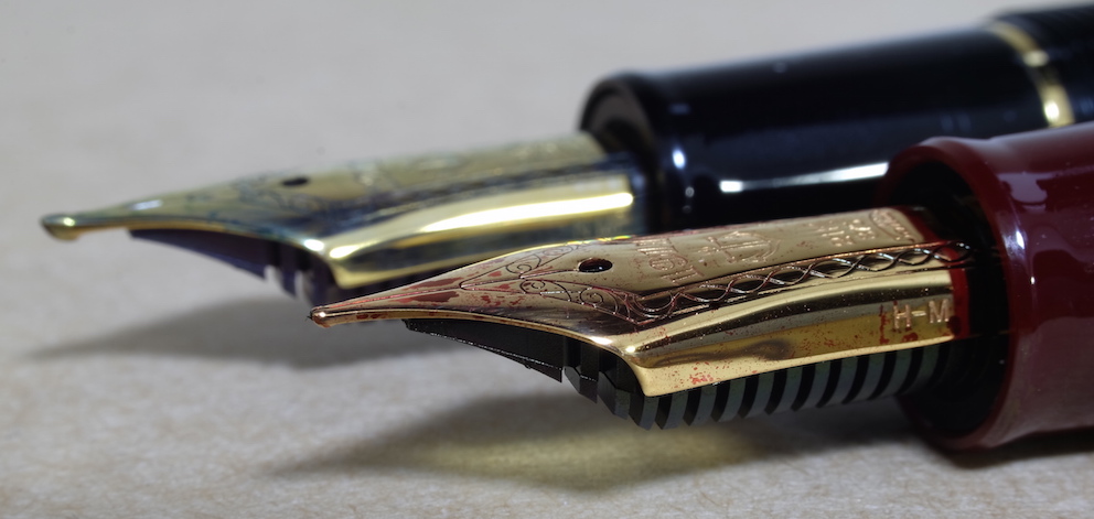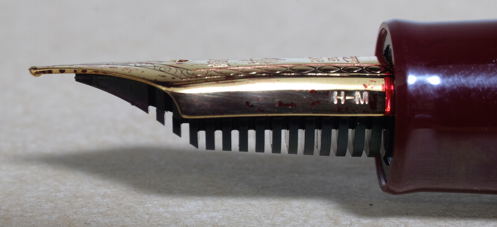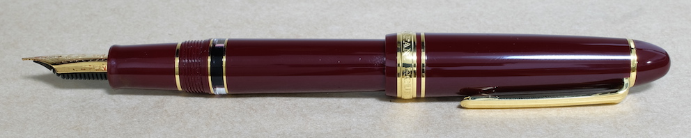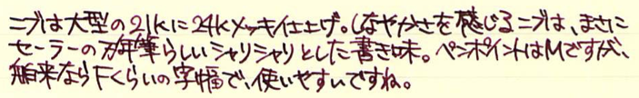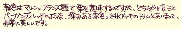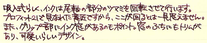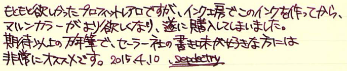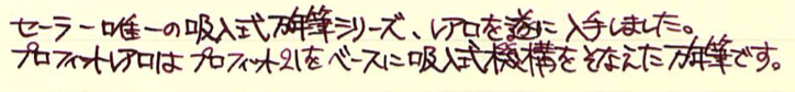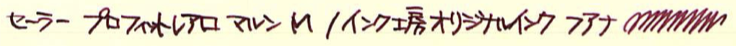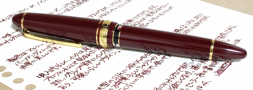 レビュー:セーラー万年筆 プロフィットレアロ Category:筆記具 Date:2015年04月10日 いつの間にやら、当ブログも60000ヒット。日頃のご愛顧ありがとうございます。割とあきっぽいわたしがここまで続くとは思ってなかったです。これからも宜しくです。さて、わたしは国産万年筆ではセーラーが一番合っているようです。そこで、セーラーの吸引式万年筆である、プロフィットレアロはずっと気になっていました。 レアロとプロフィット21の違いは、見た目はインク窓と尾軸のトリムの位置の違いのみ。これは吸引式にするために必要なデザインの変更なので、大きさや大部分のデザインはプロフィット21を元に作られている事がわかります。 以前ご紹介した、蘇芳色の色鉛筆の英名がmarronでしたので、直訳は栗色なのでしょうが、色としてはマルンは蘇芳色に近いのでしょう。黒と金の、いわゆる仏壇カラーの万年筆を見慣れているせいか、この色の組み合わせは新鮮に、美しく映りますね。 このインク窓からちらっと覗くインクが美しいですね。モンブランのインク窓はブルーやイエローなどの色が入った樹脂でしたが、こちらは透明樹脂なので、インクの色そのものが透けて見えます。オリジナルインク、フアナの色味と軸色が相まってとても綺麗です。 このシャリシャリ感が、わたしがセーラーを好きな所以でして、適度な紙面との摩擦を感じられた方が字が整うような気がするのです。癖字は直りませんが・・・。 プロフィット21長刀研ぎと並べて。ニブのサイズも同じなので、このレアロにも長刀研ぎの展開があります。字幅は通常のF、M、Bと、長刀研ぎのMF、M、B。MFが通常のものにないのがちょっと残念ですが、Mの書き味を発見できたので良しとします。 PR