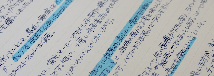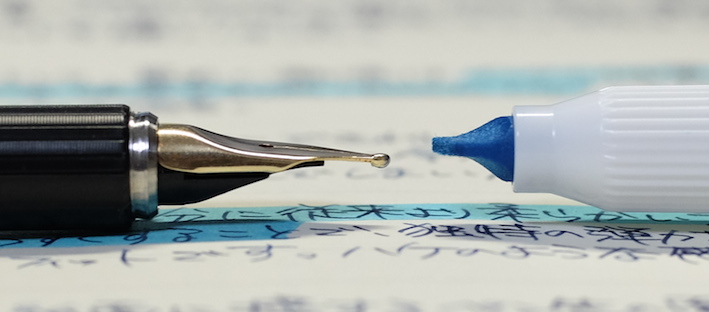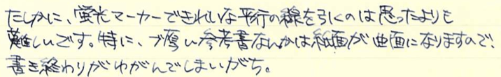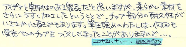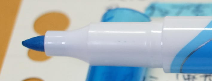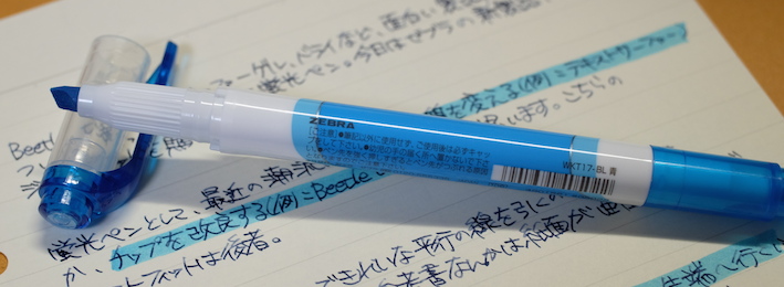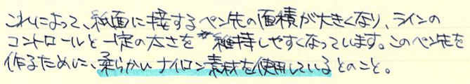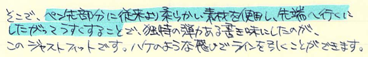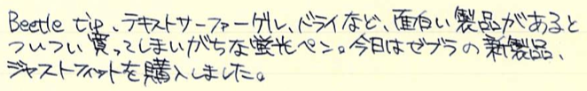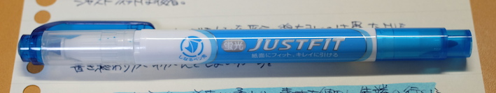 レビュー:ゼブラ ジャストフィット Category:筆記具 Date:2014年10月01日 各社さまざまなアイデアを盛り込んで、まさに蛍光ペン群雄割拠時代・・・という感じですね。わたしとしても、手頃な値段で試せる蛍光ペンはついつい新製品を買ってしまいがちなジャンルであります。(モンブランのラインマーカーのような例外はありますが。)テキストサーファードライが蛍光ペンのジャンルに入るかどうかはひとまず置いておきまして。学生から社会人まで、現代社会において幅広い需要がある蛍光ペンの世界ですから、今後もいろいろなアイデアを盛り込んだ新製品が出てくることでしょうね。 マイルドラインマーカーなどは前者、プロパスウインドウなどは後者に入ると思っています。ビートルチップもデュアルカラーなる新製品が出て、面白いことになっていますね。使い易いかはともかくとして・・・。 たとえば、ビートルチップはまっすぐきれいなラインを引くのにはかなり練習が必要な製品だと思います。三種類のラインが引けるのですが、特にダブルラインが引き難いですね。そこで、蛍光ペンでおそらく一番引かれるであろう、「文字にかぶせる太いライン」の引きやすさに、ひたすらこだわったのがこのジャストフィットです。 ラインの引き心地は、まさに「コシのある刷毛」といった感じ。従来の台形型のペン先と比べて格段に使いやすいです。素材が柔らかいため、ラインは普通の蛍光ペンよりも太めになります。 いっぽう、細めのチップはあまり真新しさを感じるものではなく、従来品よりも少し太めのラインになるかな?と言った感じ。使っているのは太めのチップと同じ素材だと思われます。あの薄さに成形するのはなかなか大変だったようです。 この先端へ行くにつれて薄くなる美しいチップ、何かに似ていると思ったら、わたしの大好きなアウロラ・アスティルのニブでした。しなやかな書き心地という点では共通する部分があると思います。メーカーのホームページによると、耐久性も従来品と同じくらいであるとの記載がありますので、実際に使ってみて確かめるつもりです。 PR