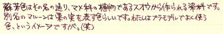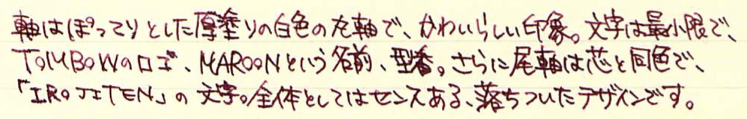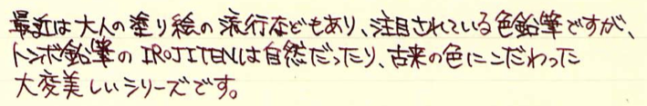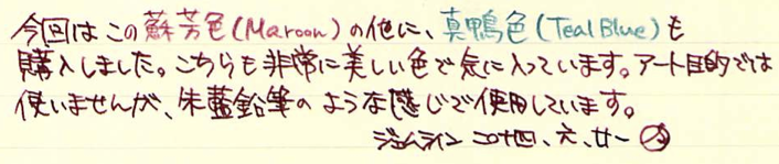 レビュー:トンボ鉛筆 色辞典 蘇芳色 Category:筆記具 Date:2014年06月21日 色鉛筆はあまり使わないのですが、あまりの美しさに買ってしまいました。 色鉛筆といえばファーバーカステルのボックス入りのものだとか、フェリシモの500色のものだとか、話題には事欠かない文房具ですね。 どちらかというと日本的な色がラインナップしています。 蘇芳はいにしえより染料に使われていて、蘇芳染めなどの染め物に使われています。現在でも染料店で手軽に手に入れられますが、使う触媒によって発色が変わったりと染め物は大変奥が深いですね。 木目が見える鉛筆の美しさも好きなのですが、この色辞典のような厚塗りの軸もいいなぁ。文字の押しもバッチリ決まっていますね。 これがまた、よく出来たパッケージなのですが、さすがに絵を描くわけではないので箱買いする理由が見つけられないんですよね。美しいは美しいのですが・・・。 最近、真鴨色に縁がありますね。クロスのティールラッカーといい、この色辞典といい。もともとが結構好きな色なのかもしれません。こんな色のインクが欲しいですね。 PR