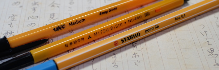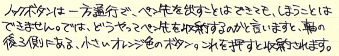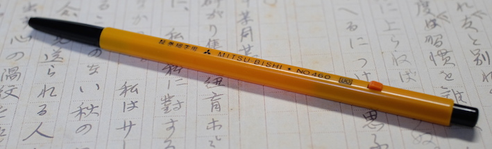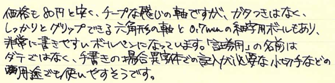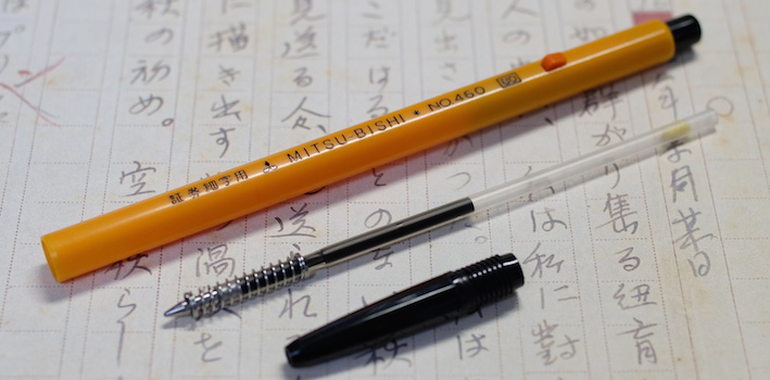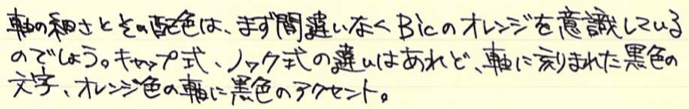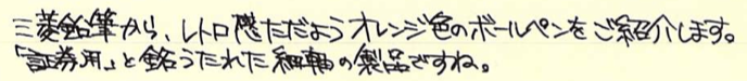 レビュー:三菱鉛筆 証券細字用 Category:筆記具 Date:2014年10月26日 オレンジ色の細身文具が続きますが、今回は国産です。三菱鉛筆の証券細字用ボールペンはおよそ40年の歴史がある製品で、公文書や証券を安定して筆記出来るという謳い文句を持っています。 オレンジと黒の配色といい、ノックを戻すときのボタンの感じなど、なんともレトロ・・・。 ちょうど、この証券細字用ボールペンが発売されたときは、Bicオレンジが活躍していたのか、軸の細さから配色から、何から何までそっくりです。このペン先の黒い部分は十二角錐のようになっていたりと、そこはかとないコダワリも感じられます。 この、小さいボタンでノックを解除する方式って昔はけっこう見た気がしますが・・・。最近はあまり見かけませんね。レトロさを感じる意匠であります。 この書きやすさ、証券用という用途以外にも愛用者は多く、何本も買いだめしている人もいるくらいです。以前は赤と青もあったようですが、現在は廃盤になっています。 オレンジ色細字系を三本並べて。特に証券細字用とBicオレンジは本当にそっくりです。樹脂の色までそっくり。ですが、使い心地は全然違う二本なので、是非書き比べてください。 PR